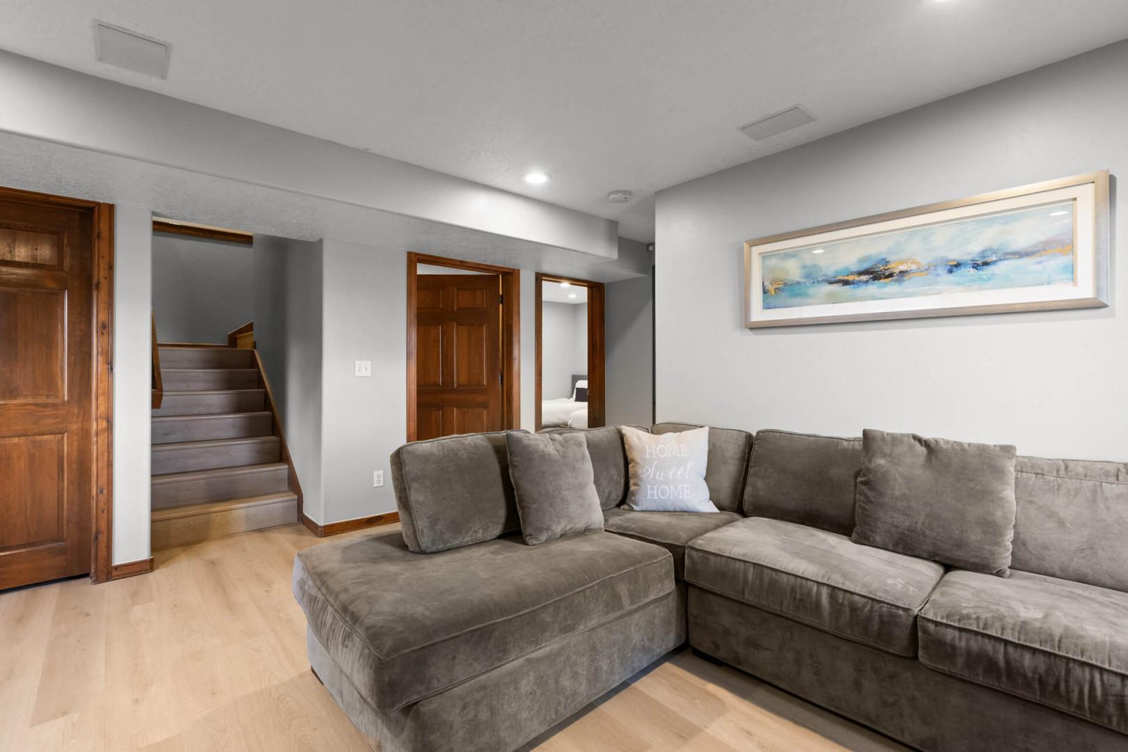 Bear Hollow Village 5458: Lower level living area with sectional seating for comfortable gathering around the fireplace