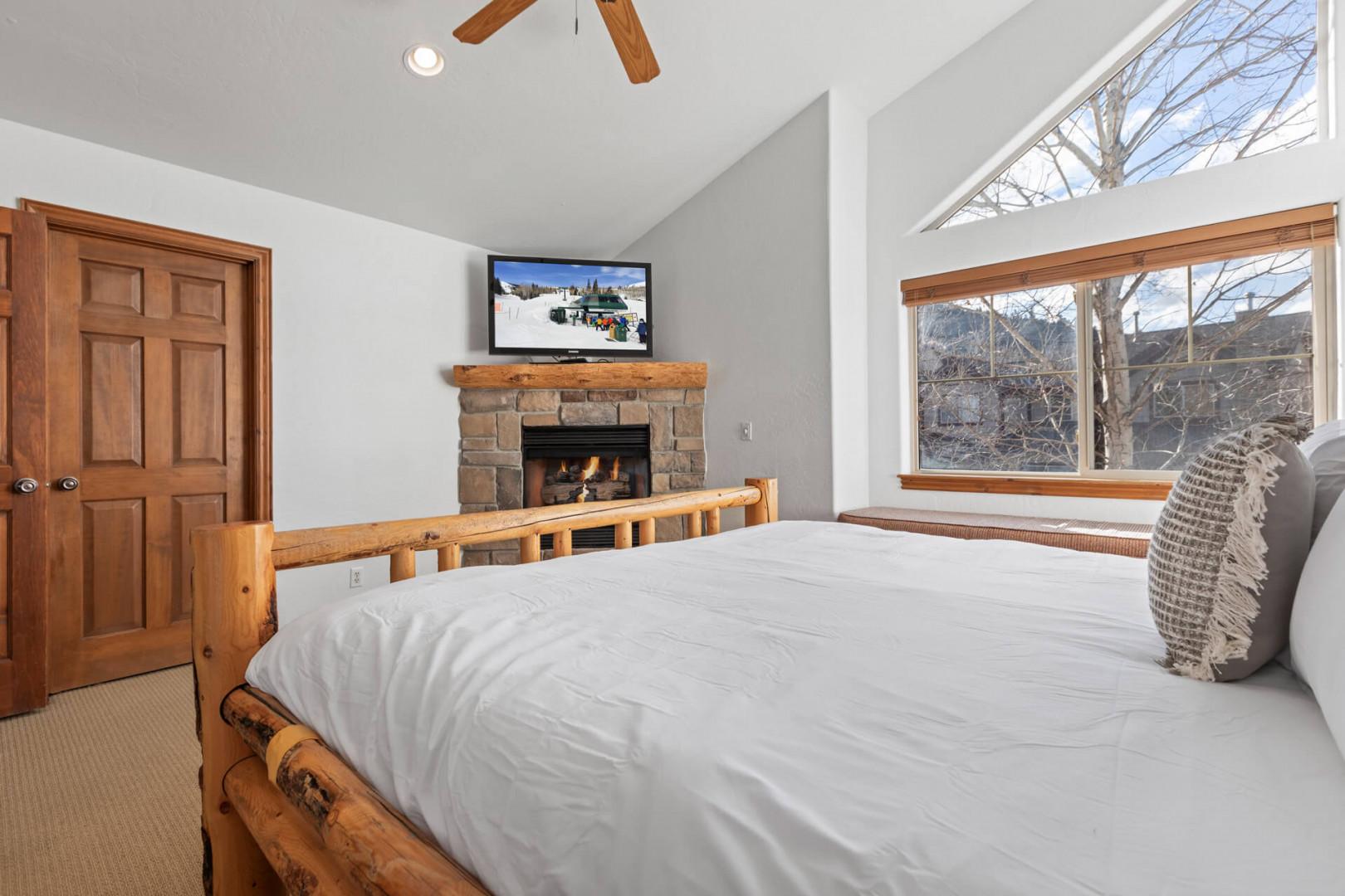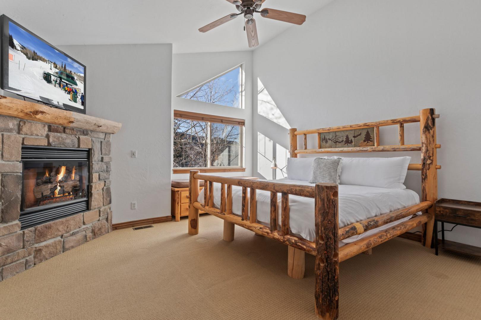 Vacation Rentals in Park City at Bear Hollow Village 5482 A: Primary bedroom with King-sized bed, private fireplace, and ensuite bathroom