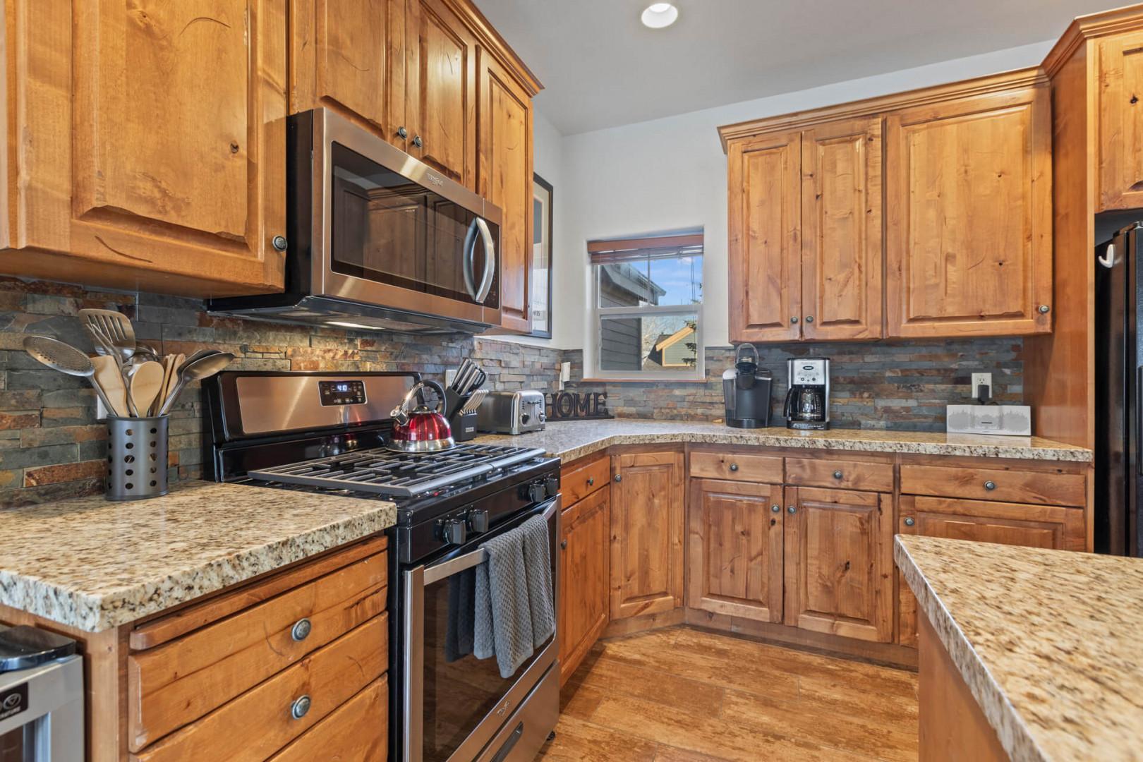 A glossy, granite island leads into the open KITCHEN and houses an efficient dishwasher and sink. Here, you’ll find a gas range, microwave oven, refrigerator, and both a Keurig coffee maker and a classic drip coffee maker. When it’s meal time, your crew can choose to pull up a stool at the center island bar or have a seat at the formal dining table in the corner.