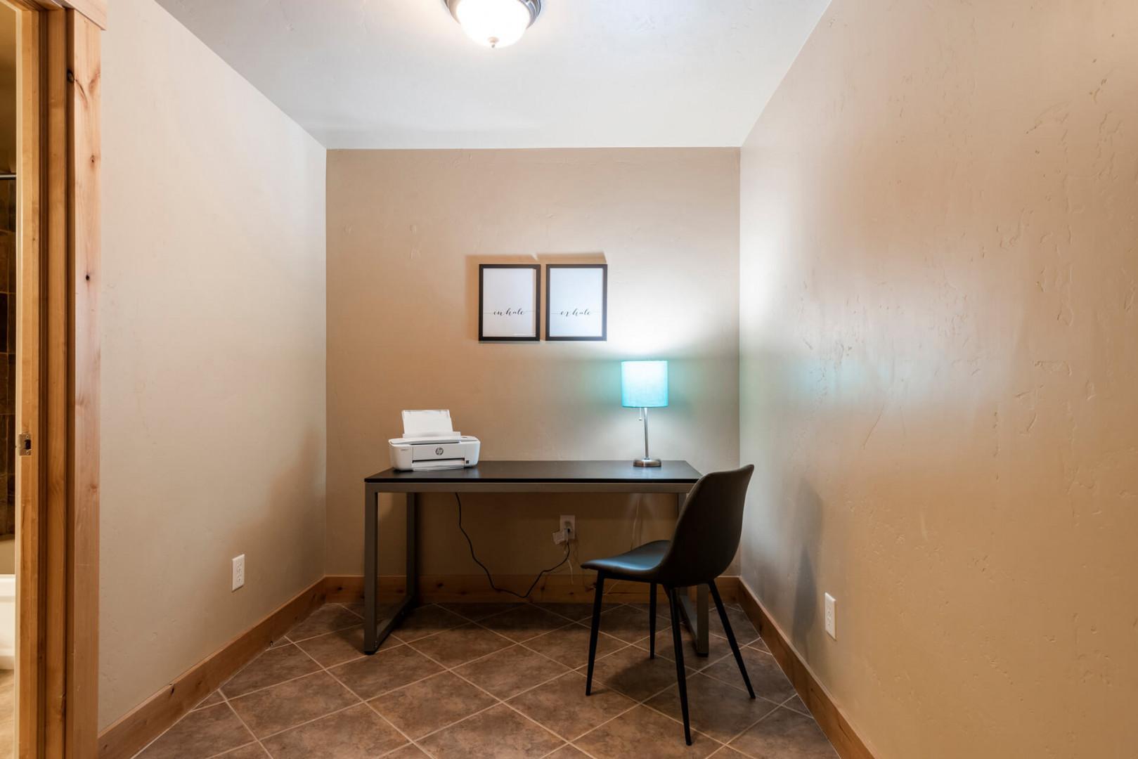 Bear Hollow 5557: Cozy workspace with desk, table, printer, and stylish lamp shade.