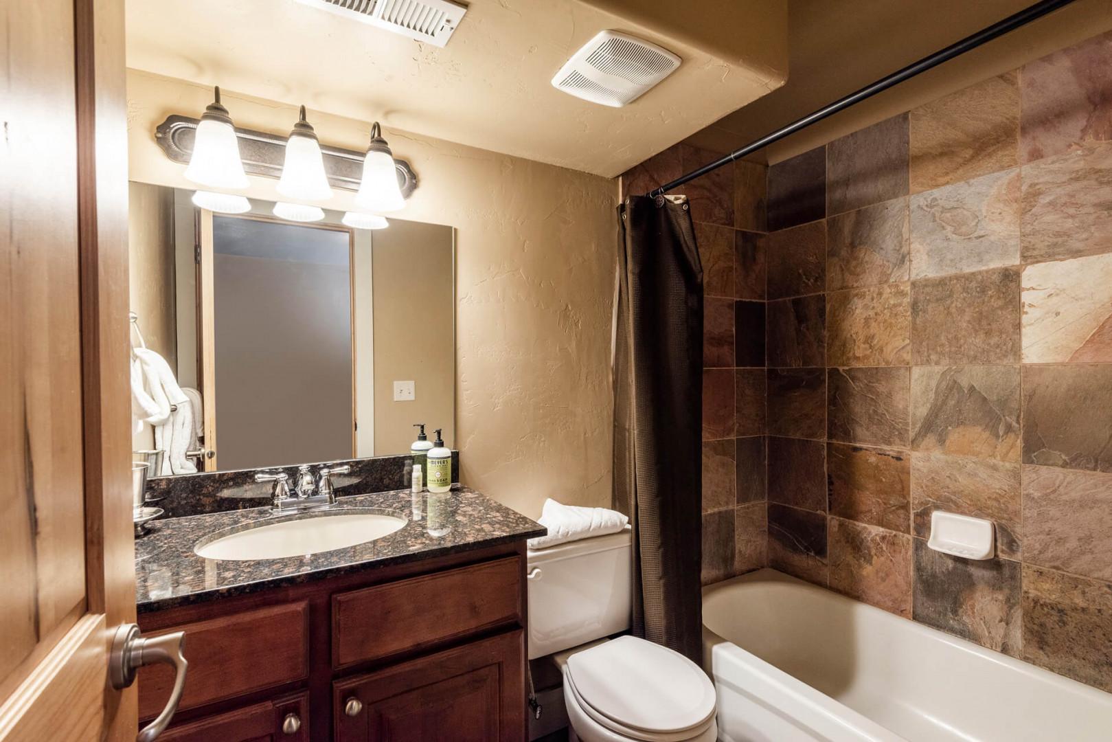 Bear Hollow 5557:Sleek sink, mirror, toilet, and convenient tub shower combo.