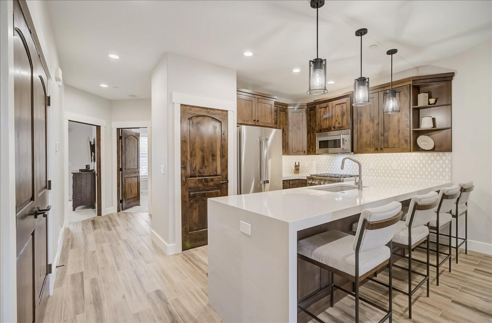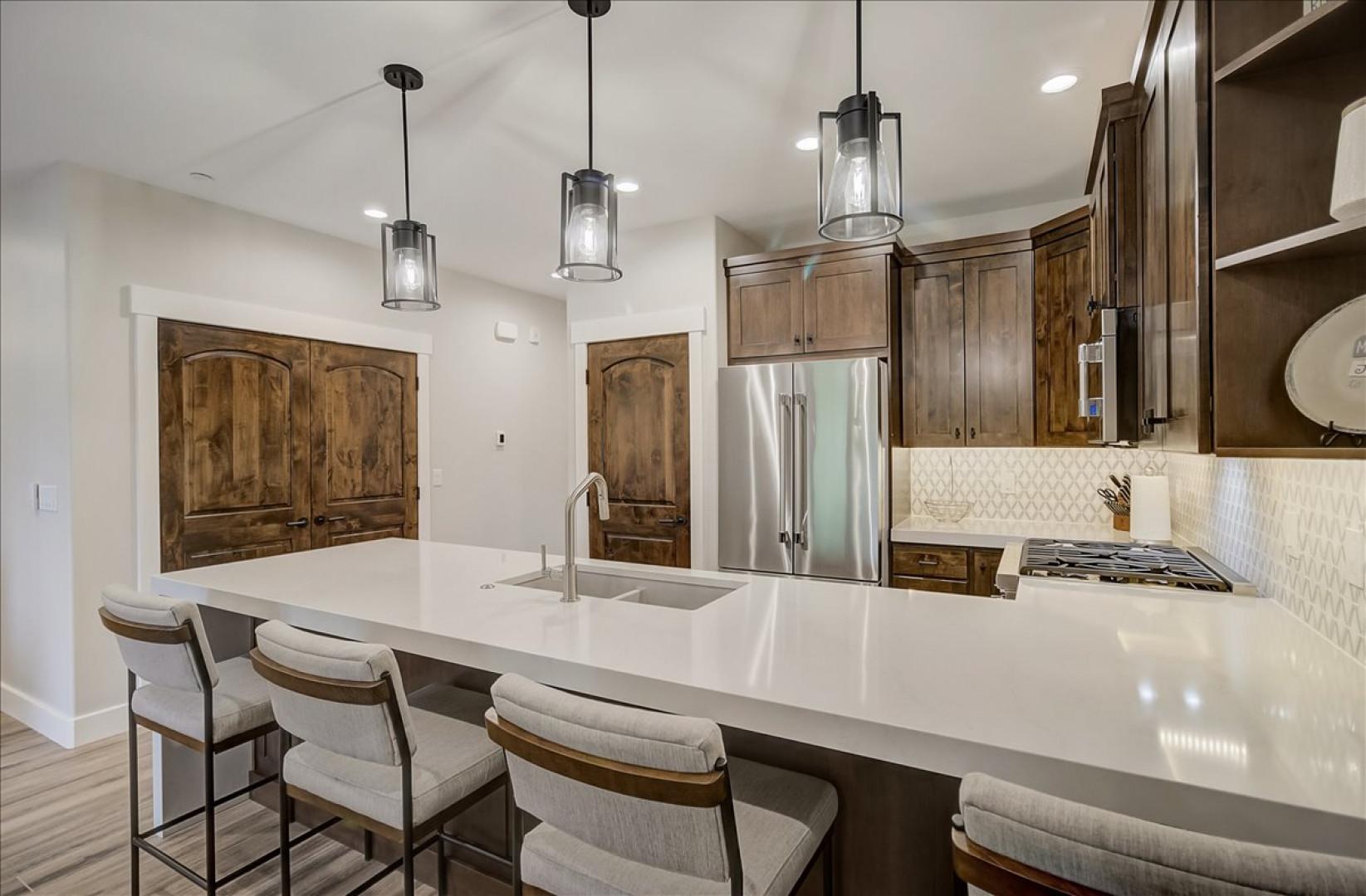 Next to the living area, a formal DINING TABLE has plenty of seating for everyone, while a casual peninsula bar with seating for four leads into the kitchen. The chef in your group will adore this space, where glossy white quartz countertops sit atop gorgeous, custom wood cabinetry. The premier appliance suite includes a huge stainless steel refrigerator, a dishwasher, a luxe gas range, and a microwave. The chef-inspired design is finished off with a chic tile backsplash.