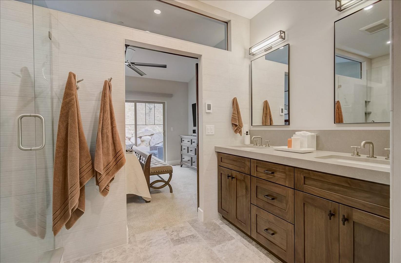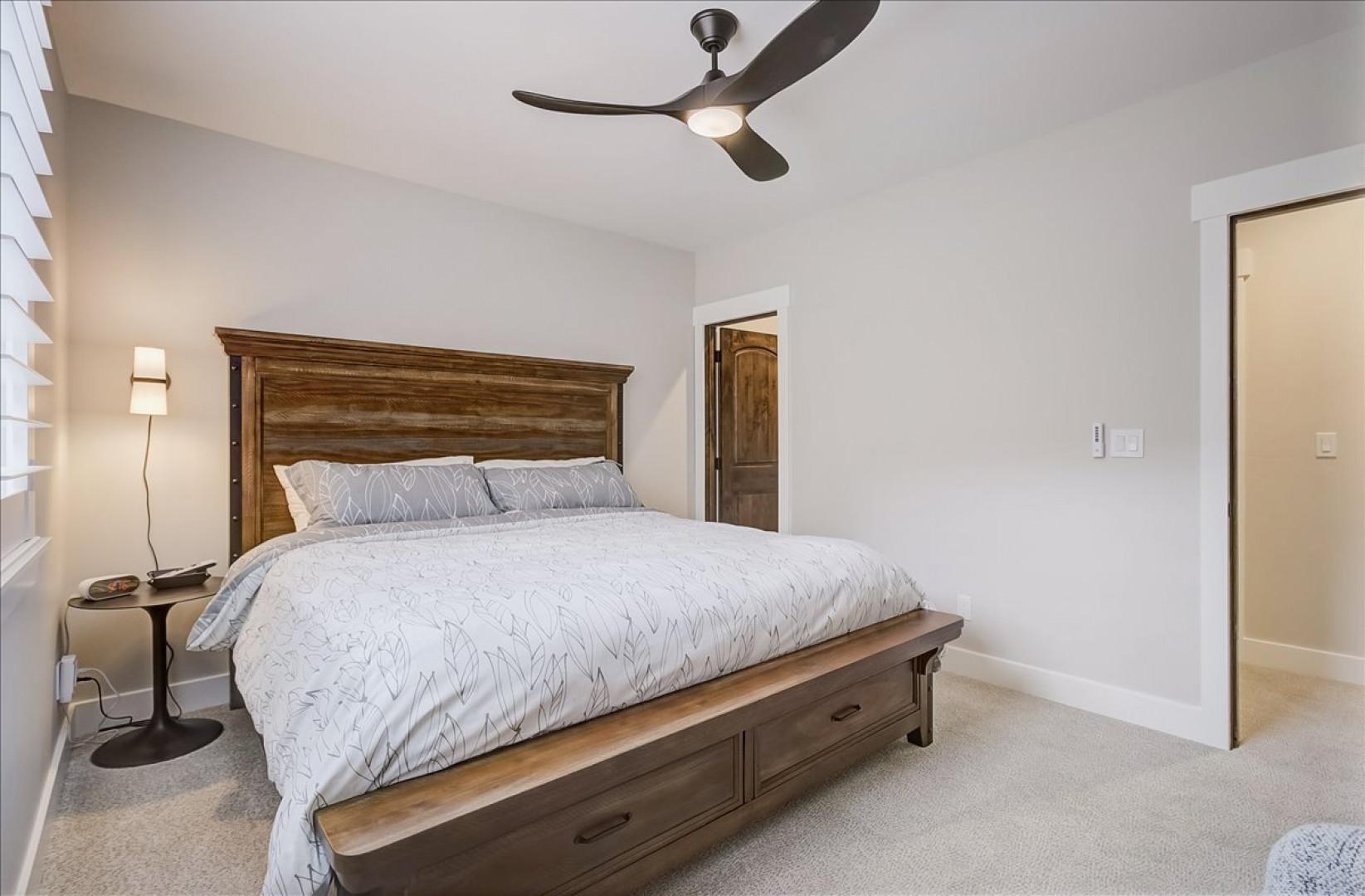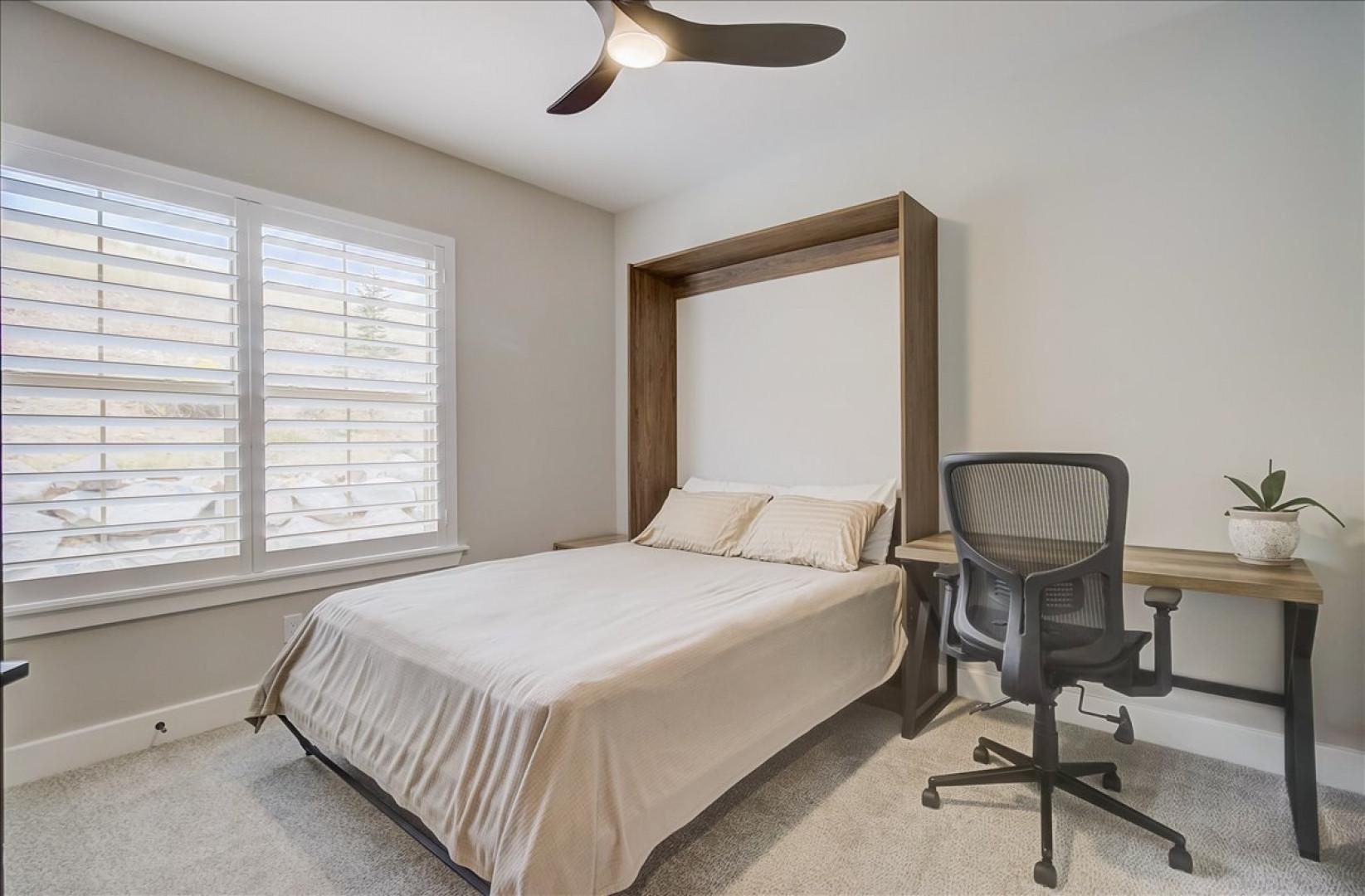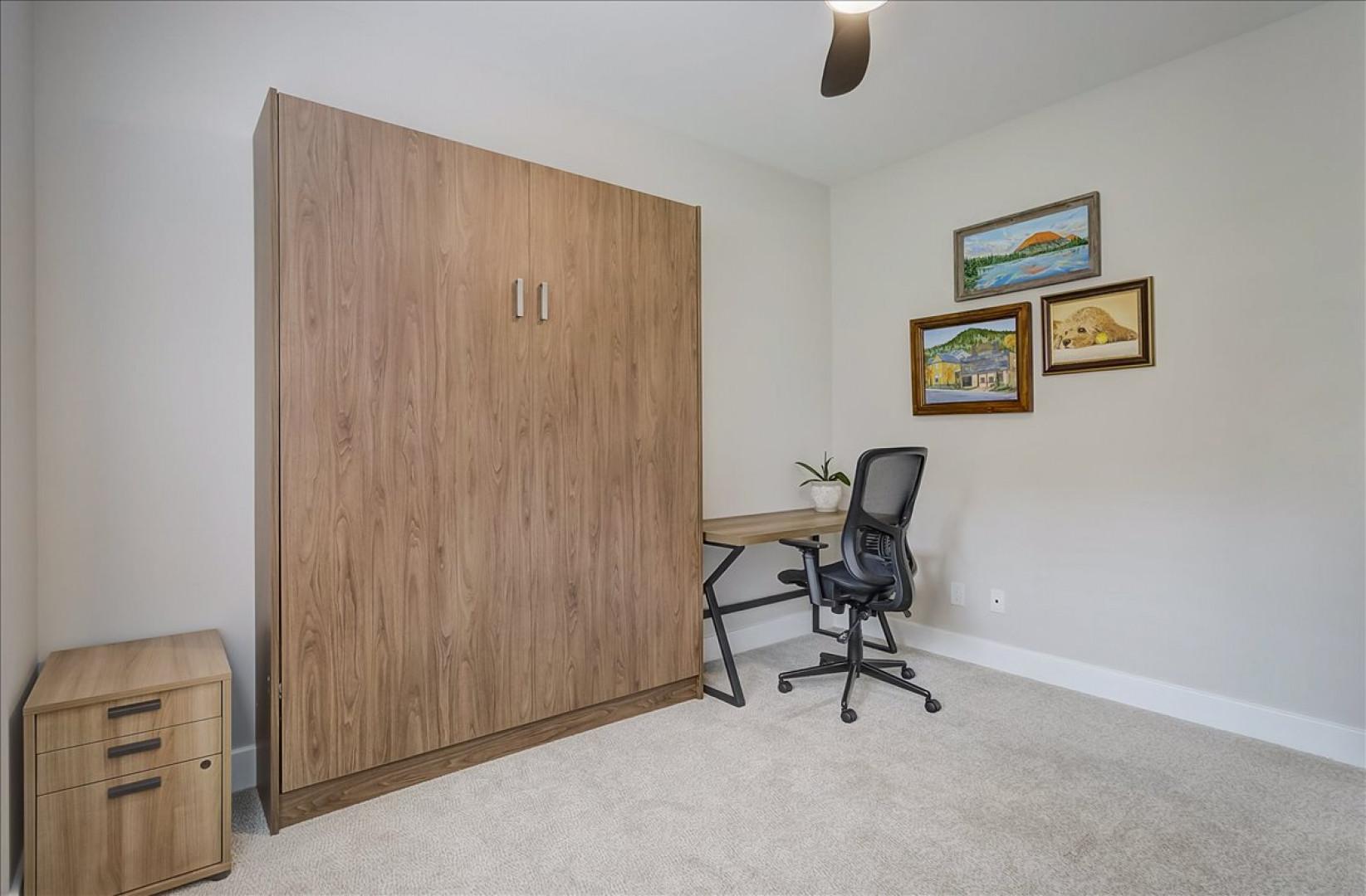 Also on this floor, you’ll find two private bedrooms. The first is the PRIMARY SUITE, which features an elegant king-size bed, an HDTV, and glass doors leading outside to the back patio. The PRIMARY ENSUITE BATHROOM includes a unique custom floor plan with a glass-enclosed shower, a dual vanity with quartz countertops, a huge walk-in closet with specially made shelving and drawers, and a separate toilet closet with a door— all on a luxurious heated floor. The second BEDROOM is an office space with a desk and a queen-sized Murphy bed that easily folds away.