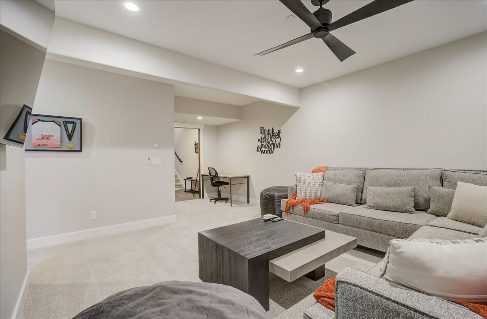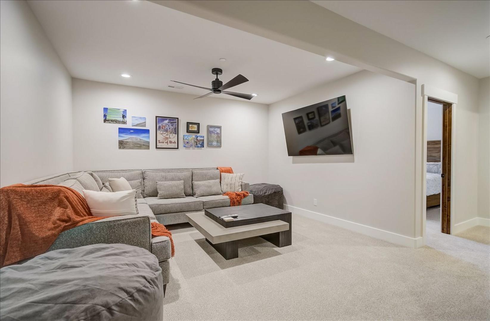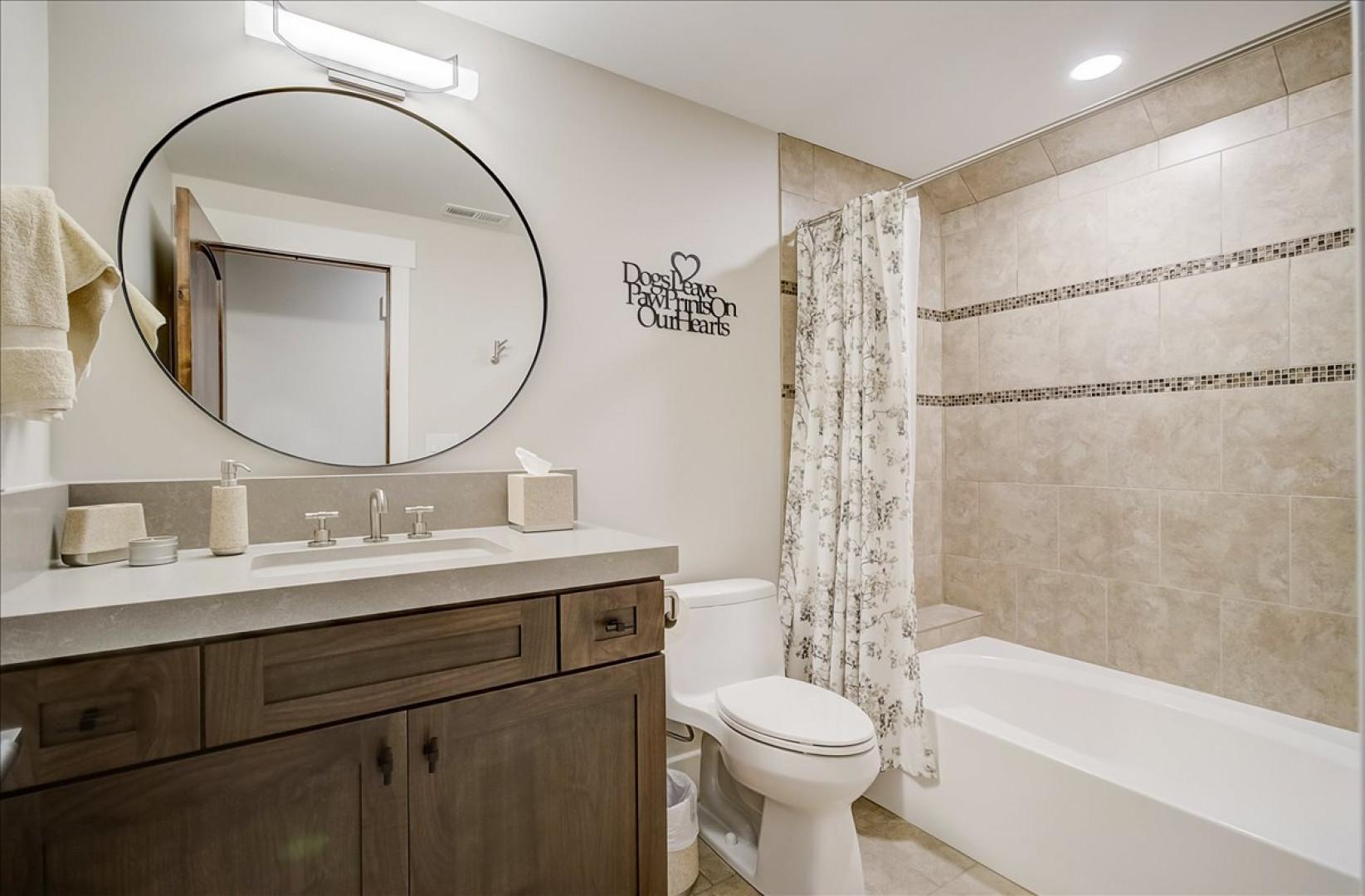 Downstairs, the SECONDARY LIVING SPACE is a comfortable spot for your whole crew to spread out and relax, with lots of room on the sectional sofa or bean bag chairs, all facing the gigantic 75-inch HDTV. Outside on the back PATIO, there’s plenty of space to kick back with a hot chocolate or your favorite cocktail at the end of the day. A center table doubles as a fire pit, which keeps everyone comfy on chilly evenings and also makes it easy to roast marshmallows with the kids. This lower level also boasts a THIRD BEDROOM with a king-size bed and another FULL BATHROOM.