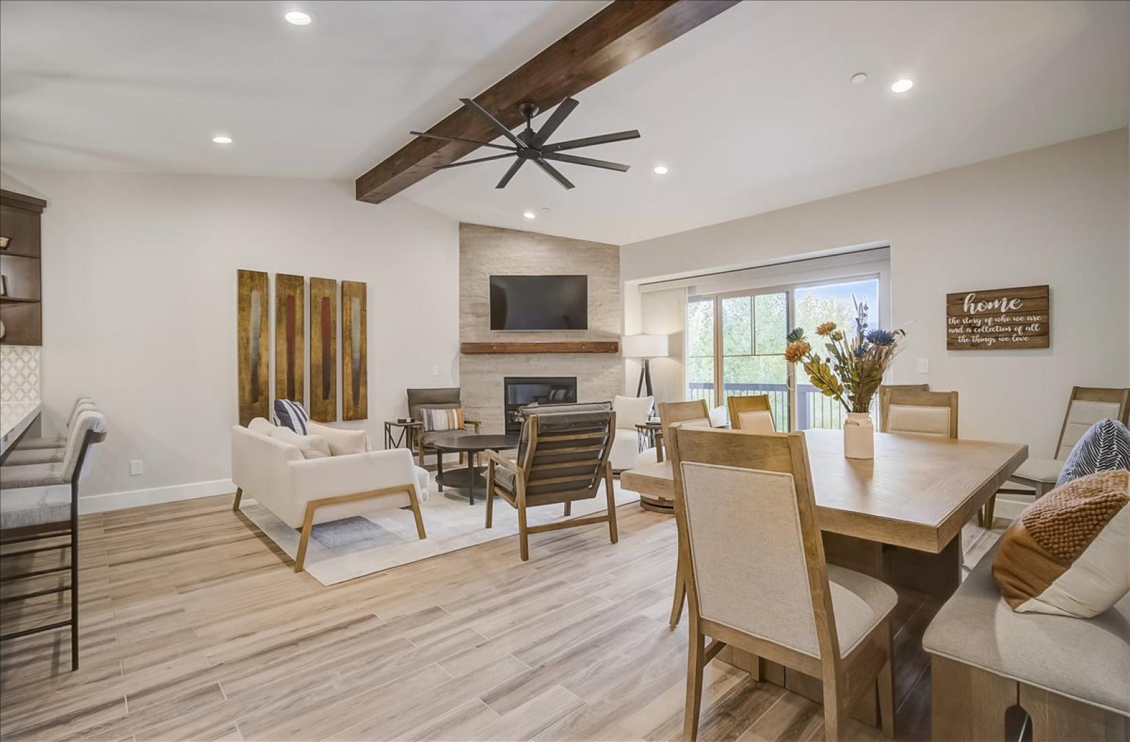 The main level of Black Rock Ridge 14202 consists of an open, inviting LIVING AREA and spacious KITCHEN. In the living space, soothing neutral furnishings surround the modern corner fireplace. Above the cozy flames, there’s a 55-inch HDTV that’s perfect for watching the game or a favorite family movie.