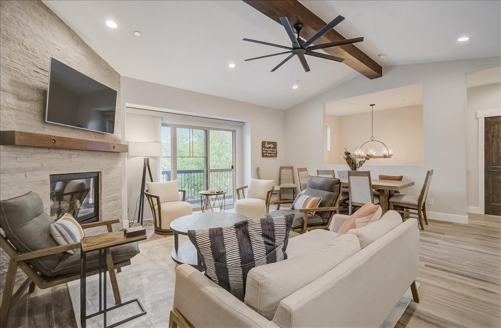 Black Rock Ridge 14202: Living Room: "Cozy space with fireplace, dining table, sofa set, and scenic balcony."
