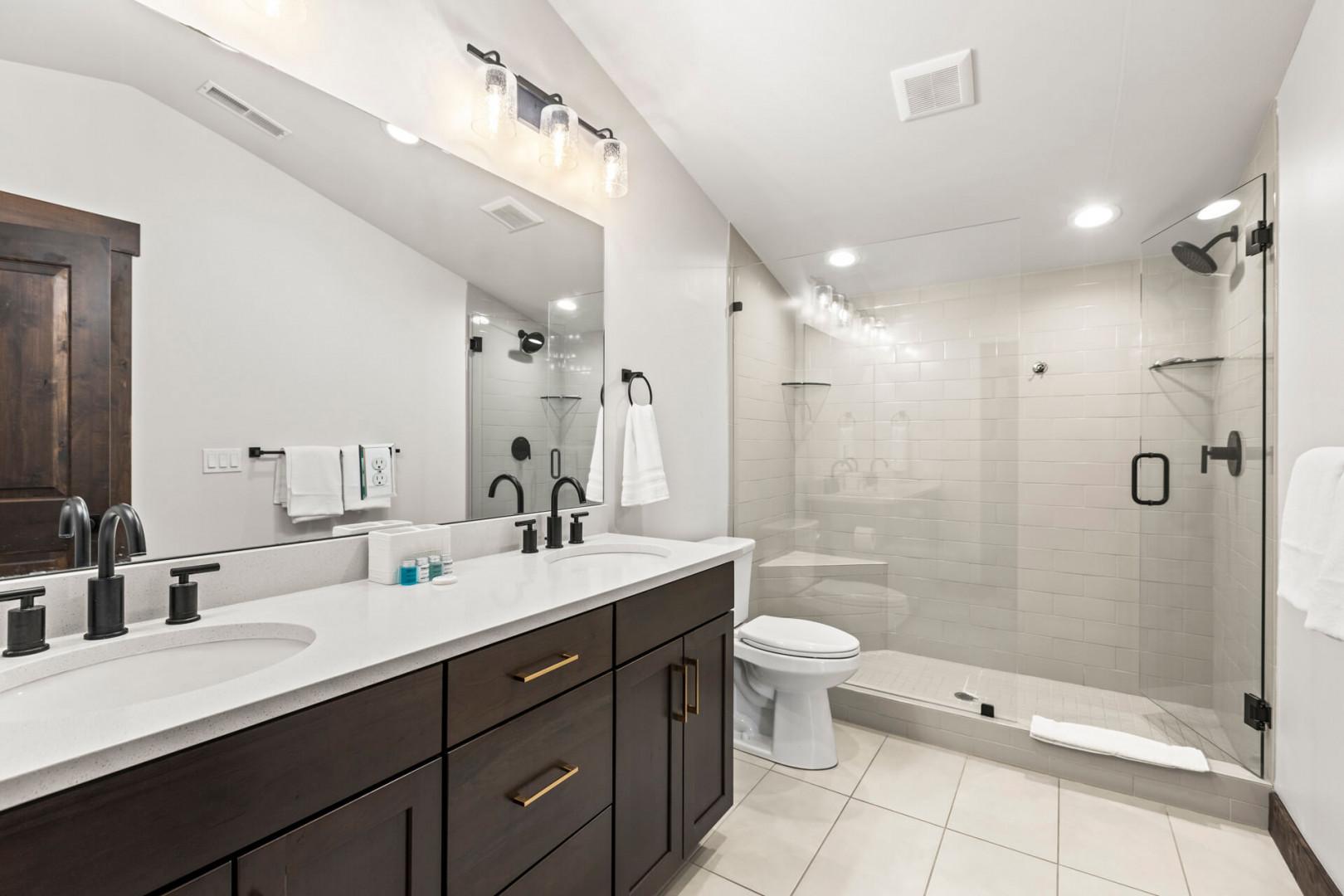 The fourth bedroom is ideal for younger guests or larger groups, featuring queen-over-queen bunk beds that sleep up to four people. This room also has an ensuite bathroom with a walk-in shower, dual sink vanity, and a hairdryer, ensuring everyone has a comfortable place to freshen up.