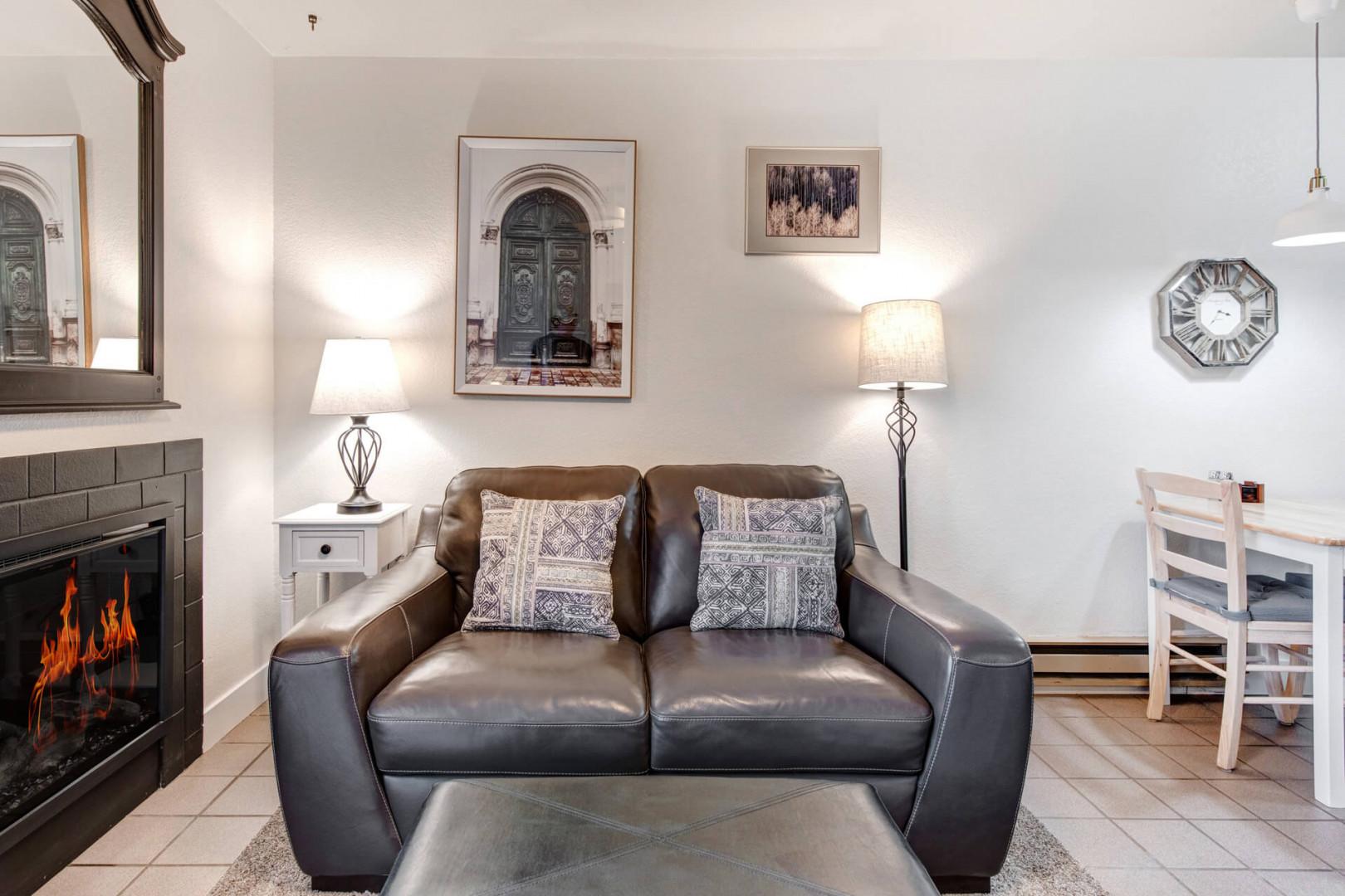Welcome to your perfect getaway at the Carriage House Condos, nestled in the Prospector Square area. This charming condo is ideal for couples or small families, featuring a plush queen bed, a desk, and additional sleeping arrangements. Unwind in the cozy living area with a ceiling fan, smart TV, and electric fireplace, or step onto the common deck. Modern bathroom amenities and a ceiling fan enhance your stay.