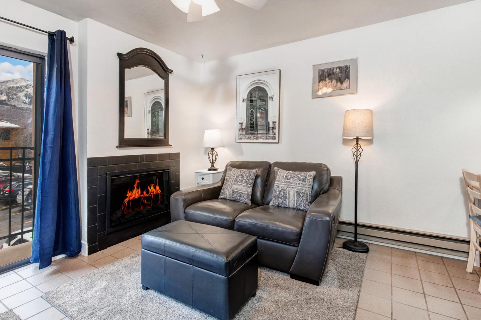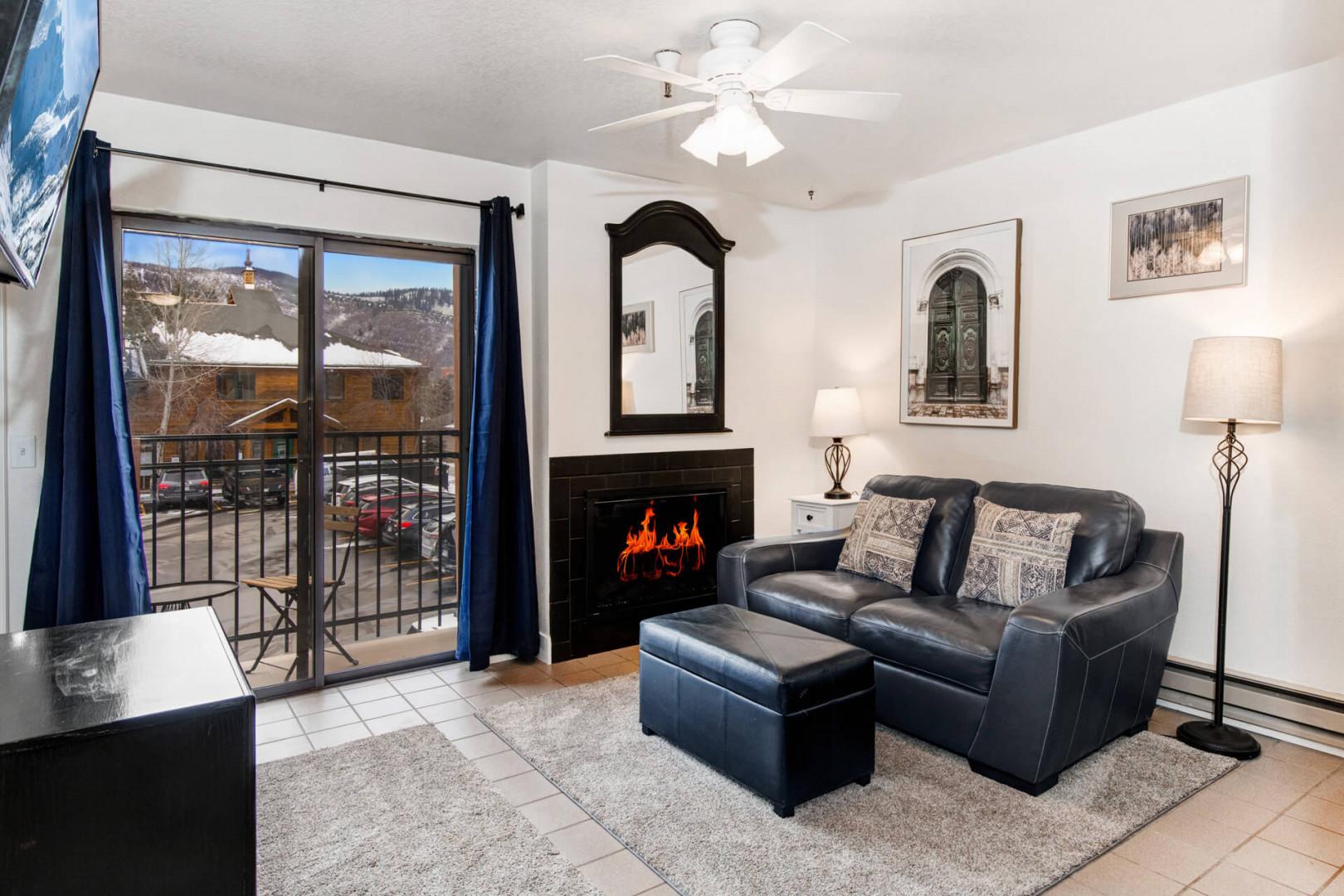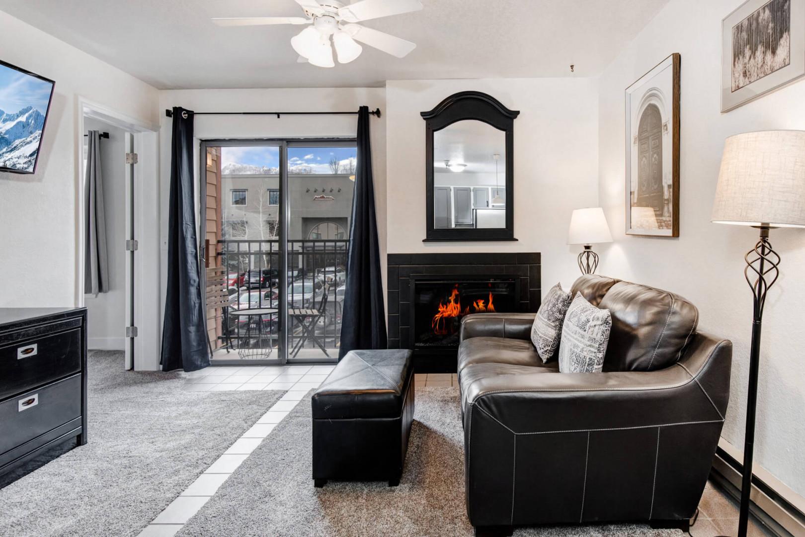 Vacation Rentals in Park City at Carriage House 305: Living Room - gas fireplace, patio, TV