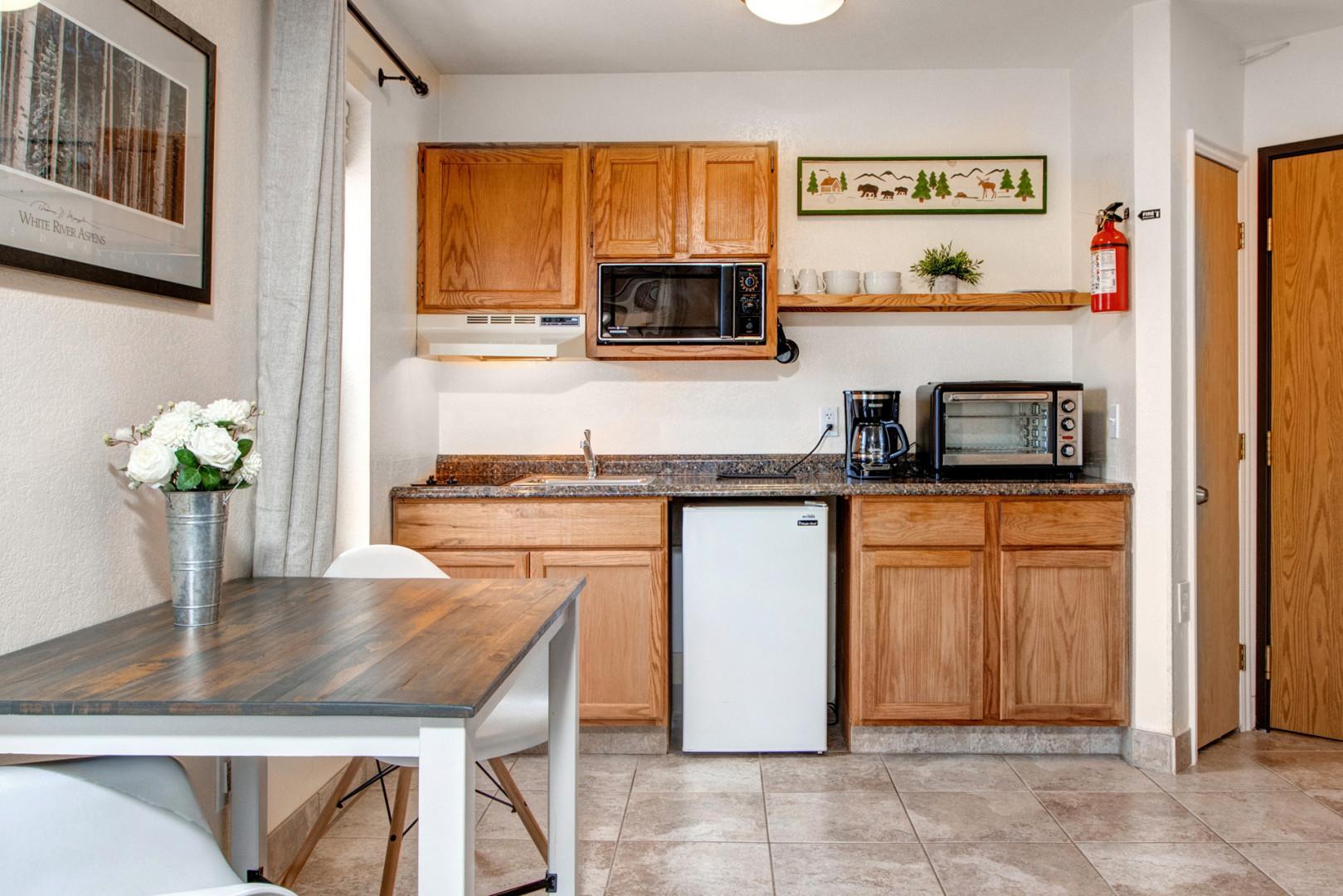 The kitchenette is equipped with a small fridge, 2-burner cook-top, and microwave, making it easy to prepare light meals and snacks. Enjoy your culinary creations at the cozy dining table, ideal for casual dining or a quick bite before heading out to explore.