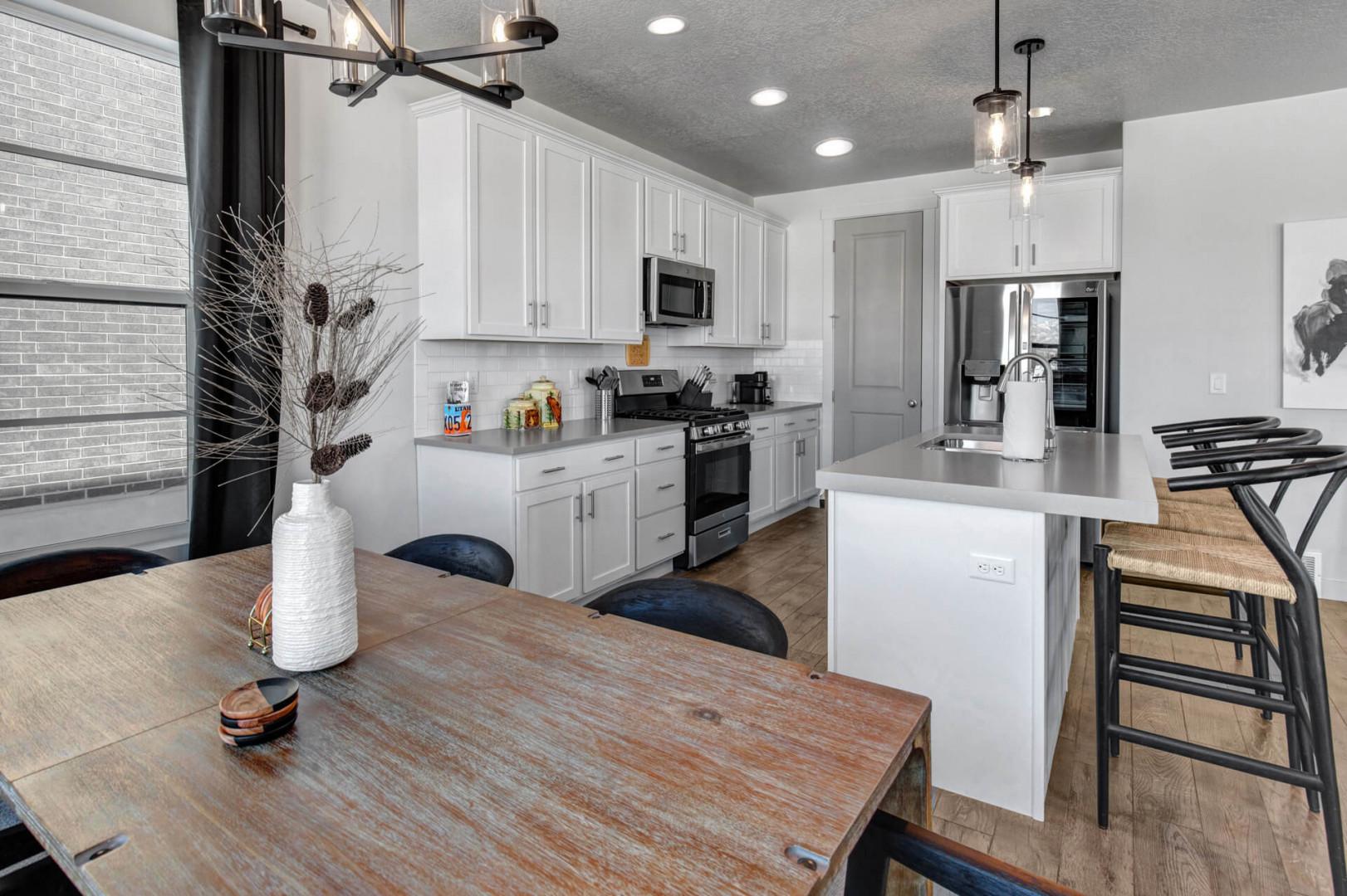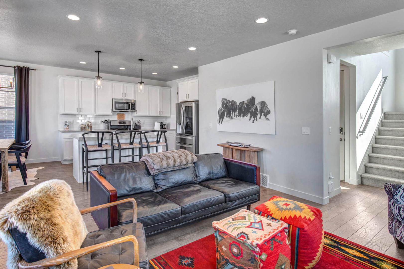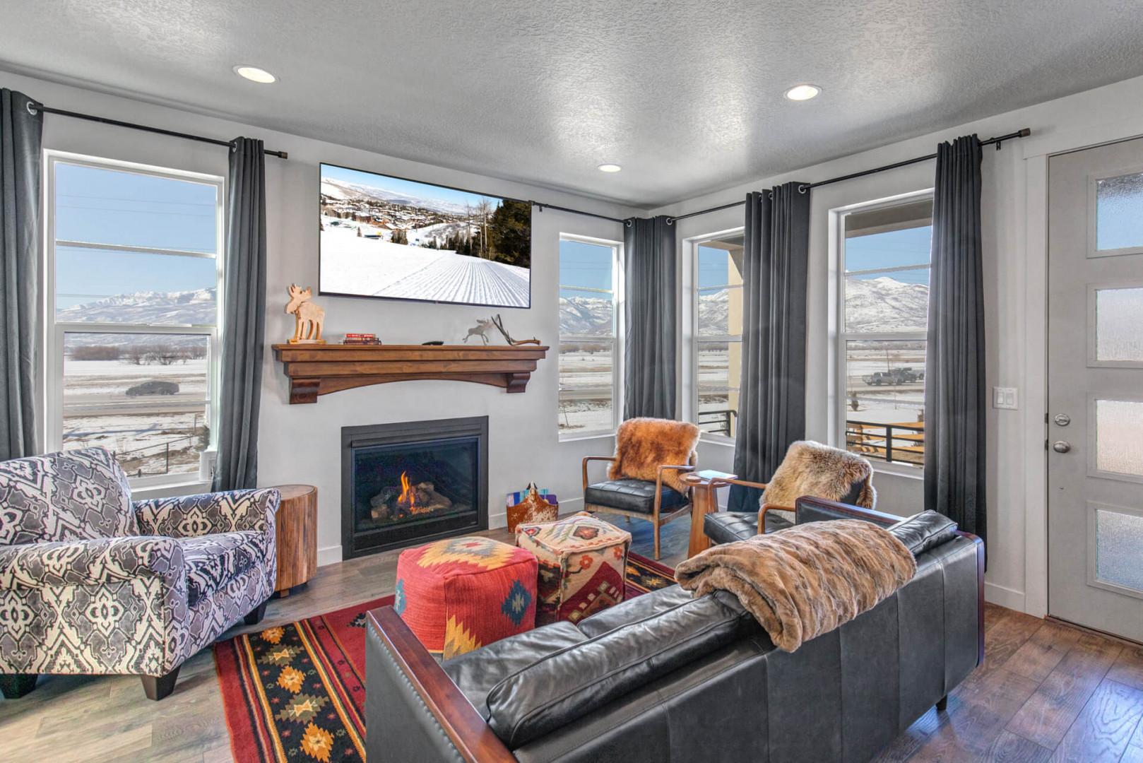 Close to hiking trails, Deer Valley East Village, and Jordanelle Reservoir, as you step inside, you'll be captivated by the elegant design and warm ambiance of the LIVING ROOM. With a plush seating area centered around a 65" LG Smart TV and a gas fireplace, this space invites you to unwind after a day of exploration. The room is adorned with numerous windows, offering breathtaking mountain views from every angle, which fill the space with natural light and enhance the serene atmosphere. The open-concept layout seamlessly connects the living area to the dining room, where a table seating six awaits your culinary creations. The adjacent bar seating for three offers a casual spot for morning coffee or evening cocktails, making it a versatile space for relaxation and socializing with family and friends.