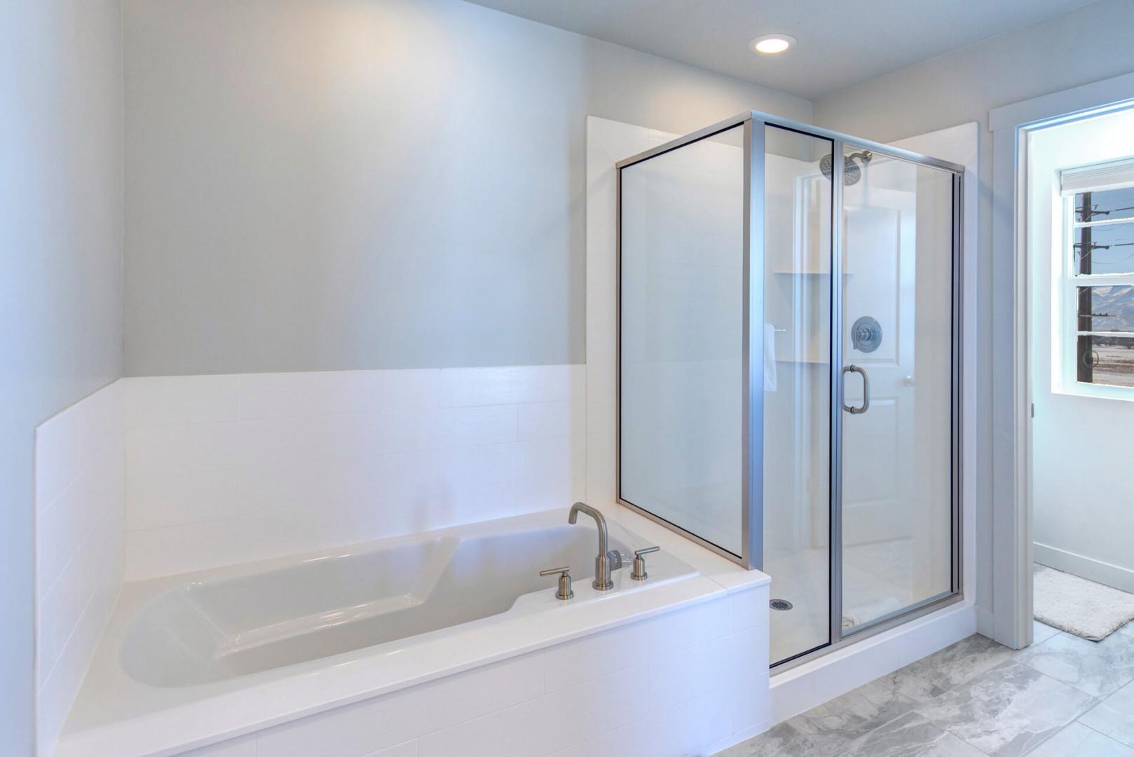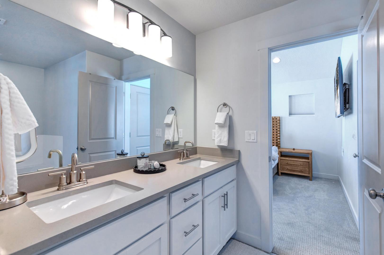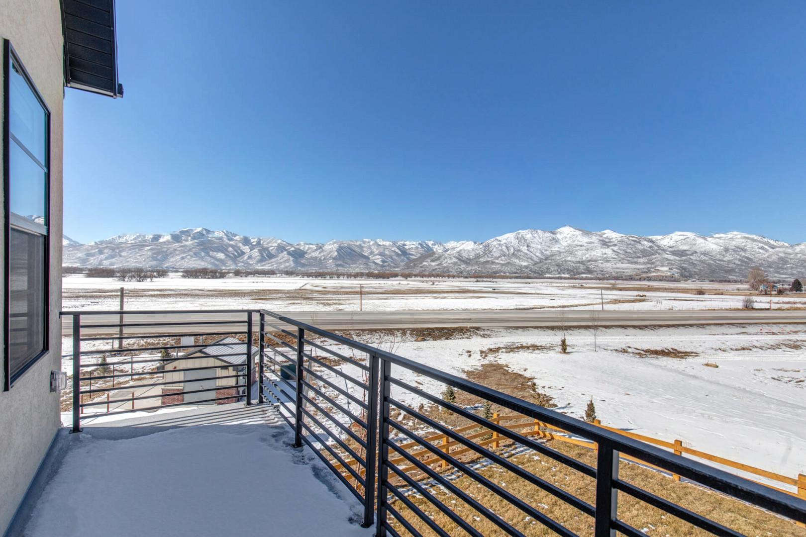 Retreat to the luxurious PRIMARY BEDROOM, a sanctuary featuring a king-sized bed and an ensuite bathroom that exudes spa-like tranquility. Indulge in the separate tub and shower, dual sink vanity, and lighted mirror, all while enjoying natural light streaming through the window. Step onto the balcony patio to soak in the panoramic views of the Timpanogos Mountain Range—a sight that promises to soothe your soul.