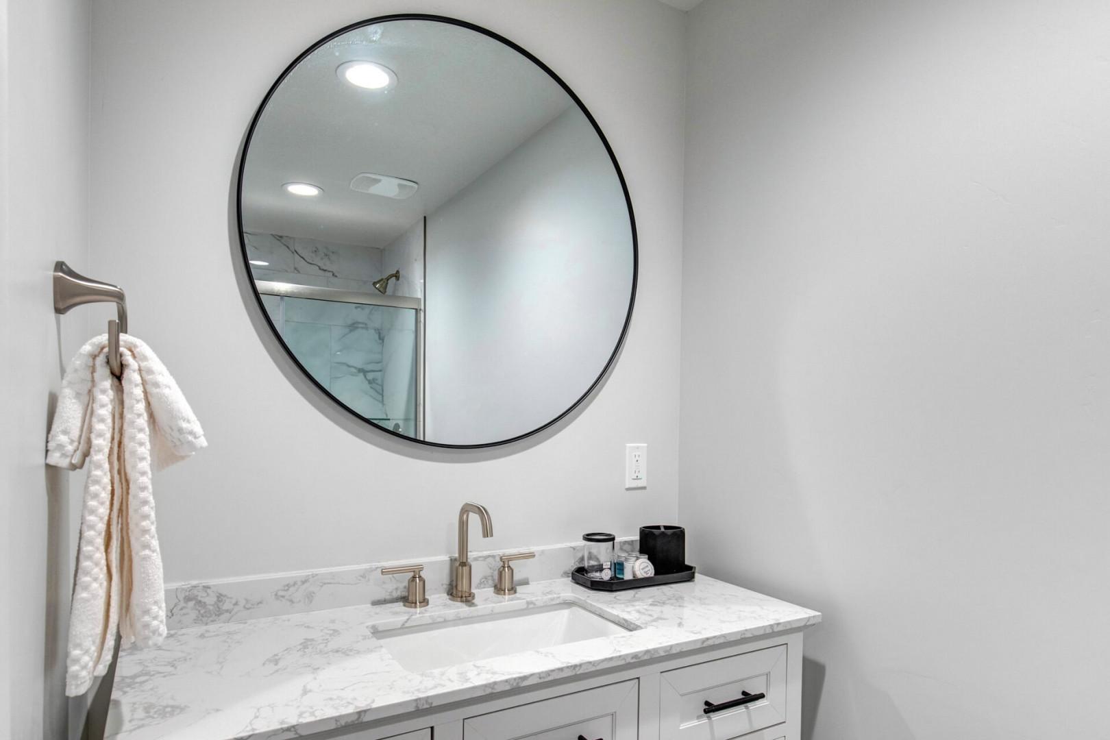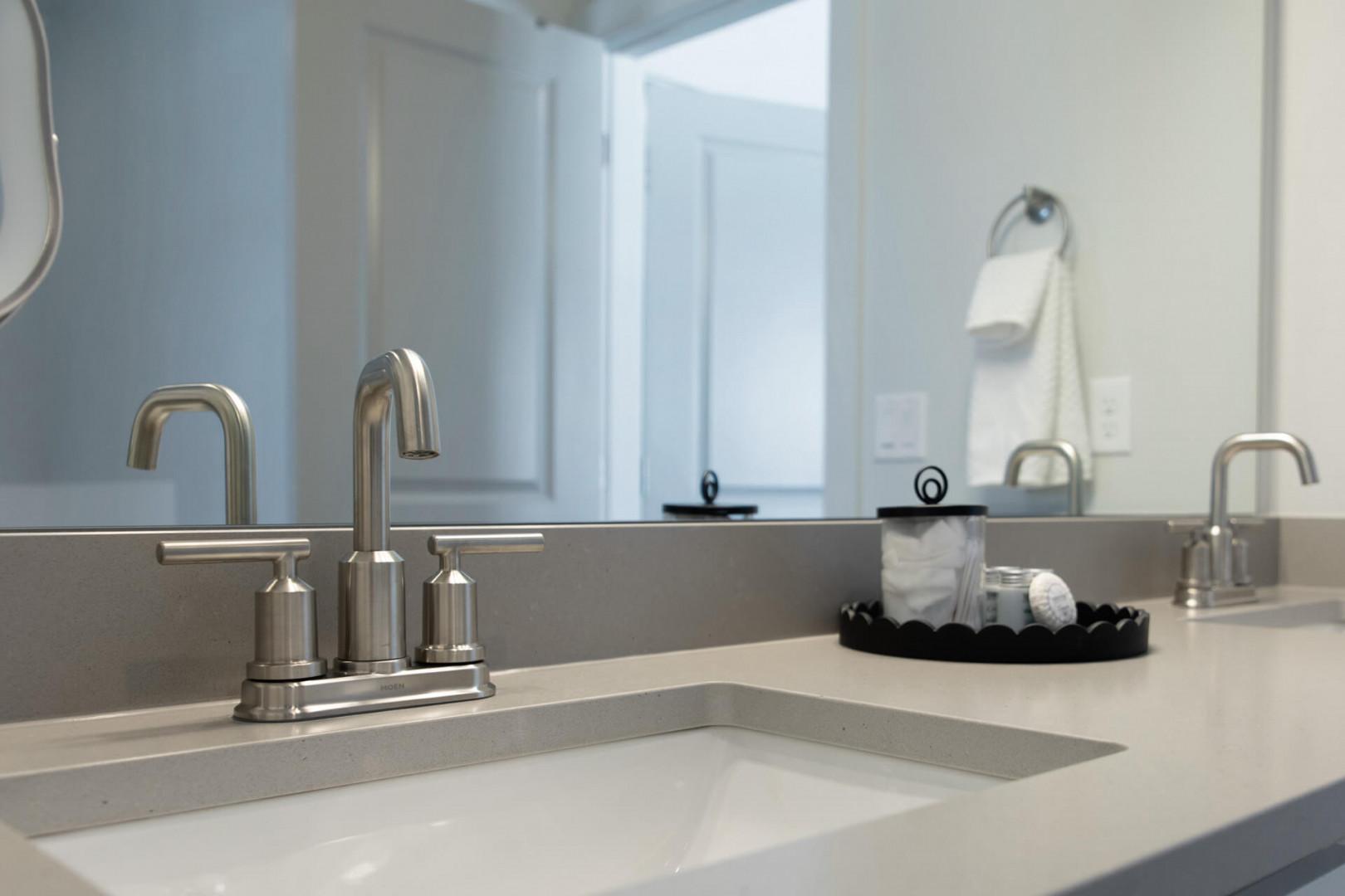The SECOND AND THIRD BEDROOMS are equally inviting, each equipped with a queen bed, ceiling fan, and 55" Smart TV. These rooms share a beautifully appointed bathroom with a tub-shower combo, bidet, and ample natural light. For additional guests, a queen air bed that can be perfectly placed in the LOWER-LEVEL DEN is raised and self-inflatable with a headboard, ensuring everyone can rest comfortably. A convenient half bathroom is located on the main floor, while the lower level features a bathroom with a shower and bidet.