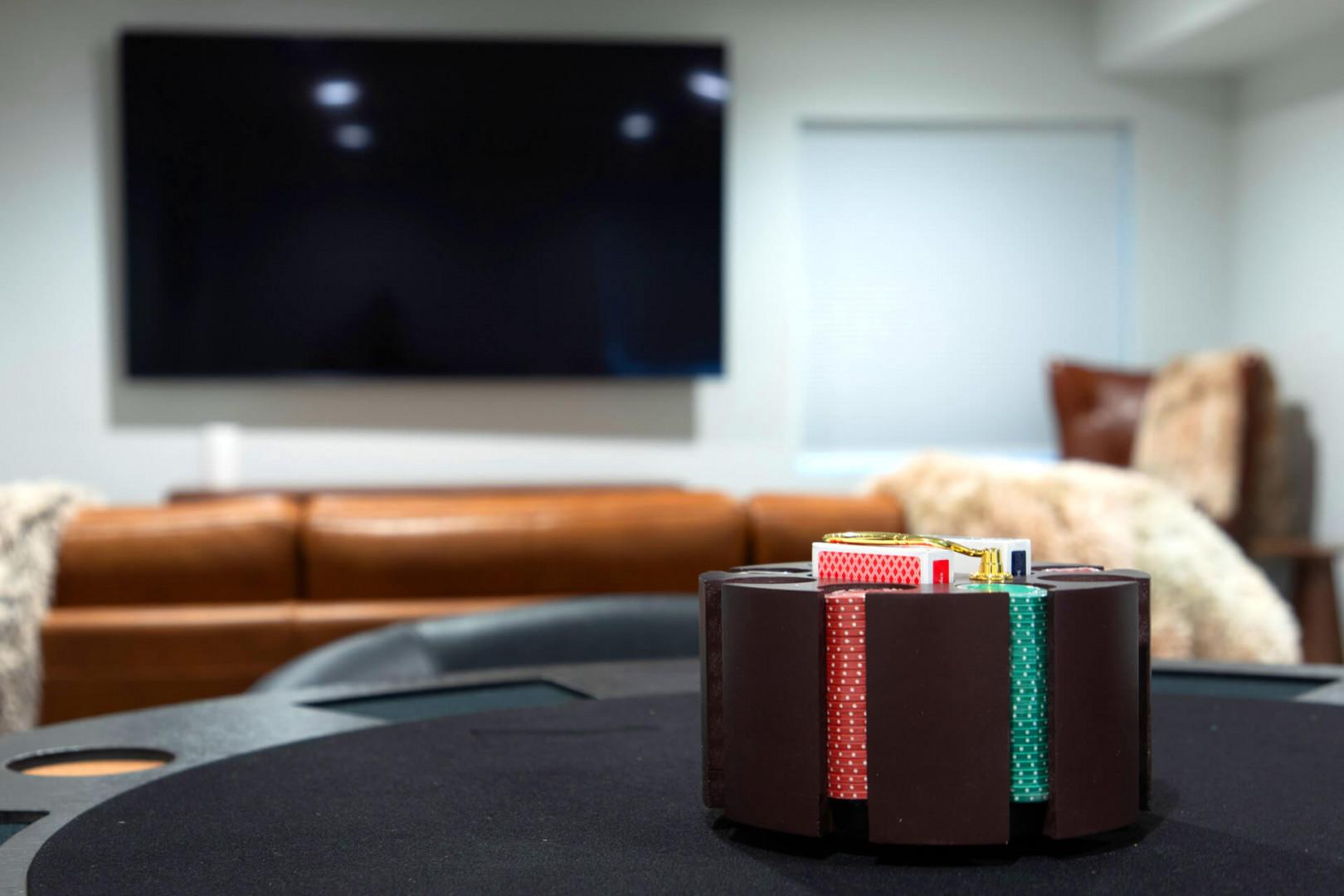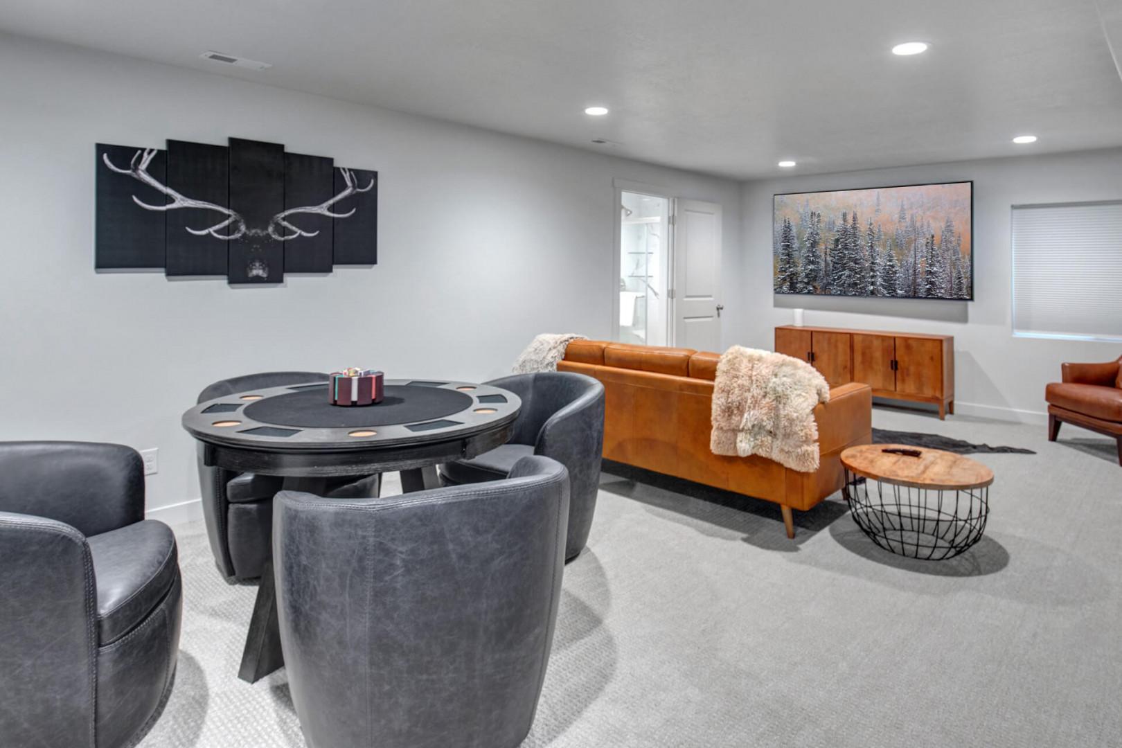 ENTERTAINMENT OPTIONS abound in this home, with an 85" TV in the downstairs den, perfect for movie nights that will delight the whole family. Challenge your companions to a round of poker or enjoy classic games like Catana, UNO, and puzzles at the poker and game table. On warm summer nights, relax on the basement patio, equipped with a table and chairs, and revel in the crisp mountain air.