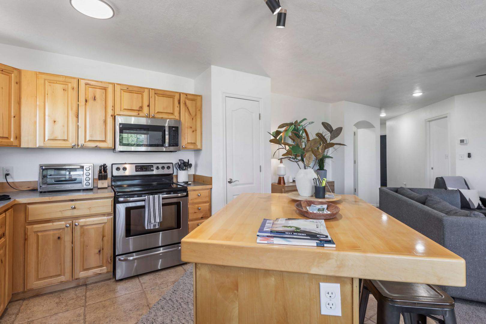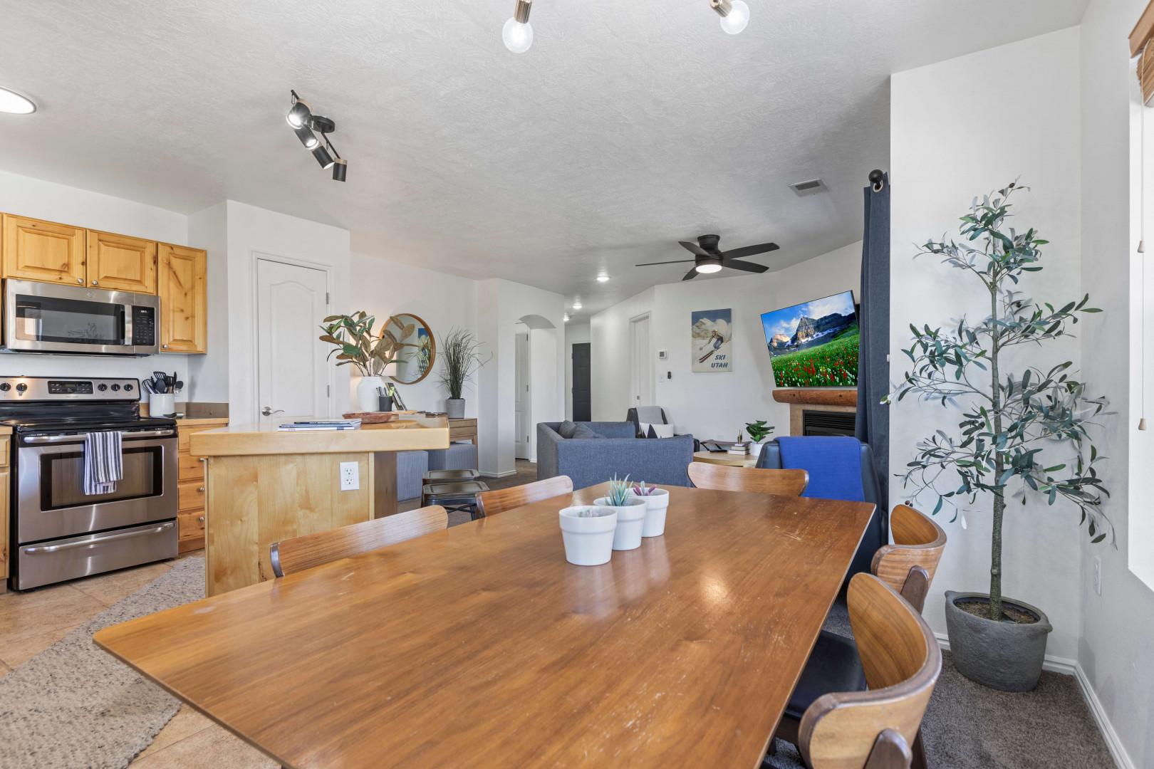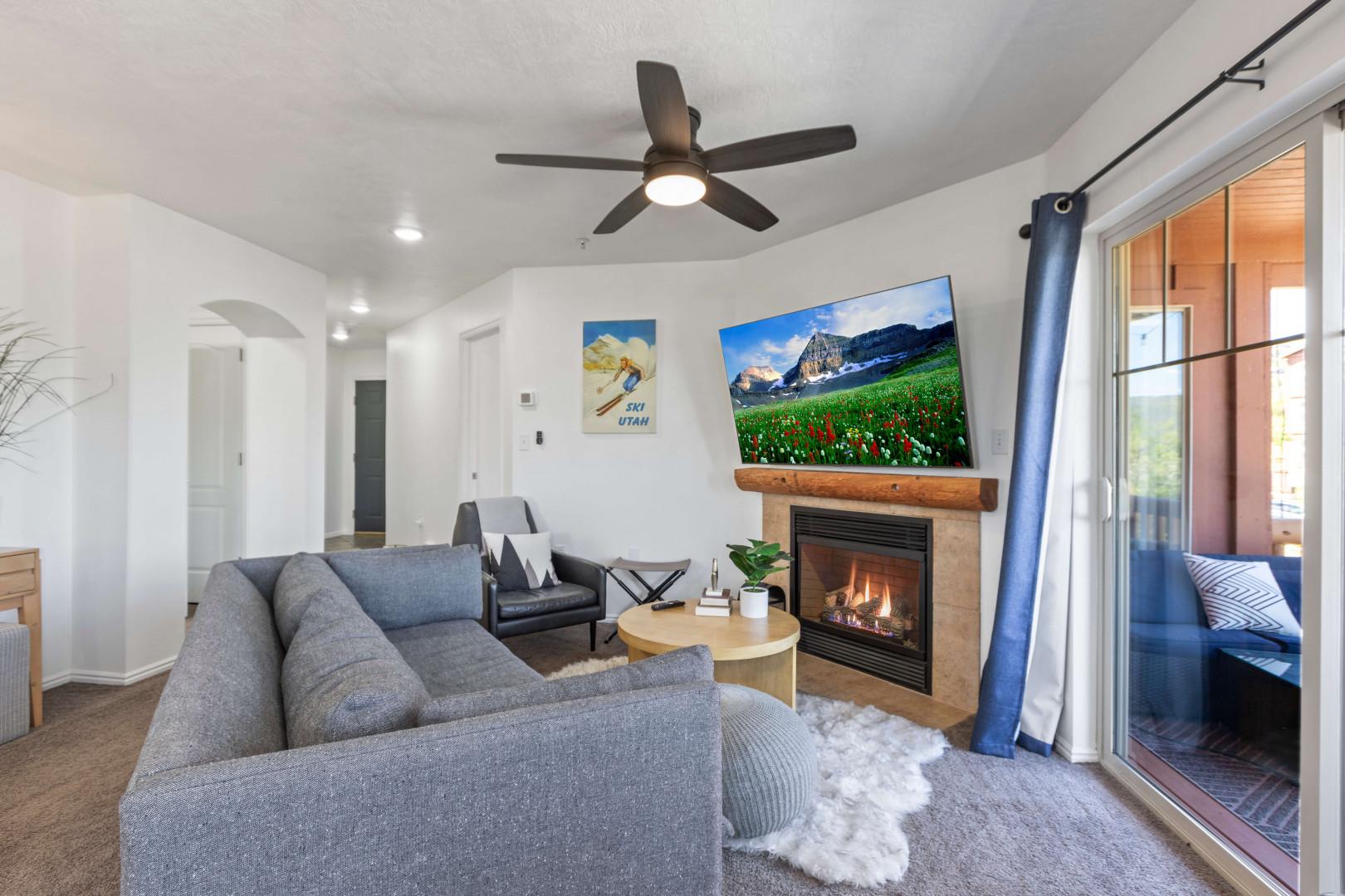Step inside and be greeted by a warm and inviting living space, complete with a cozy gas fireplace that’s perfect for cool summer evenings or snowy winter days. The fully equipped kitchen is a dream, featuring a blender, corkscrew, drip coffee maker, dishware, glassware, cookware, toaster oven, and wine glasses—everything you need for meal prep and dining. The dining table seats six, with additional seating for two at the bar, making it ideal for family meals or entertaining guests.