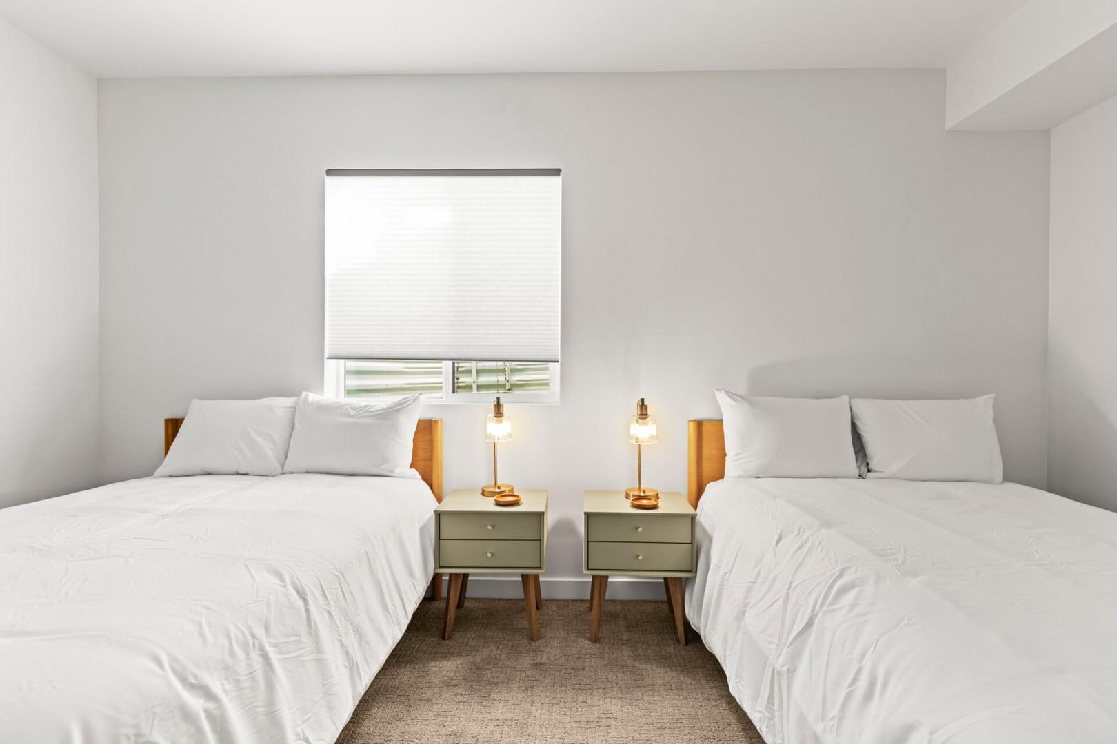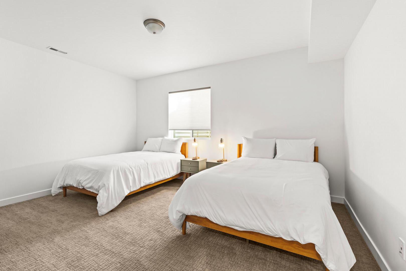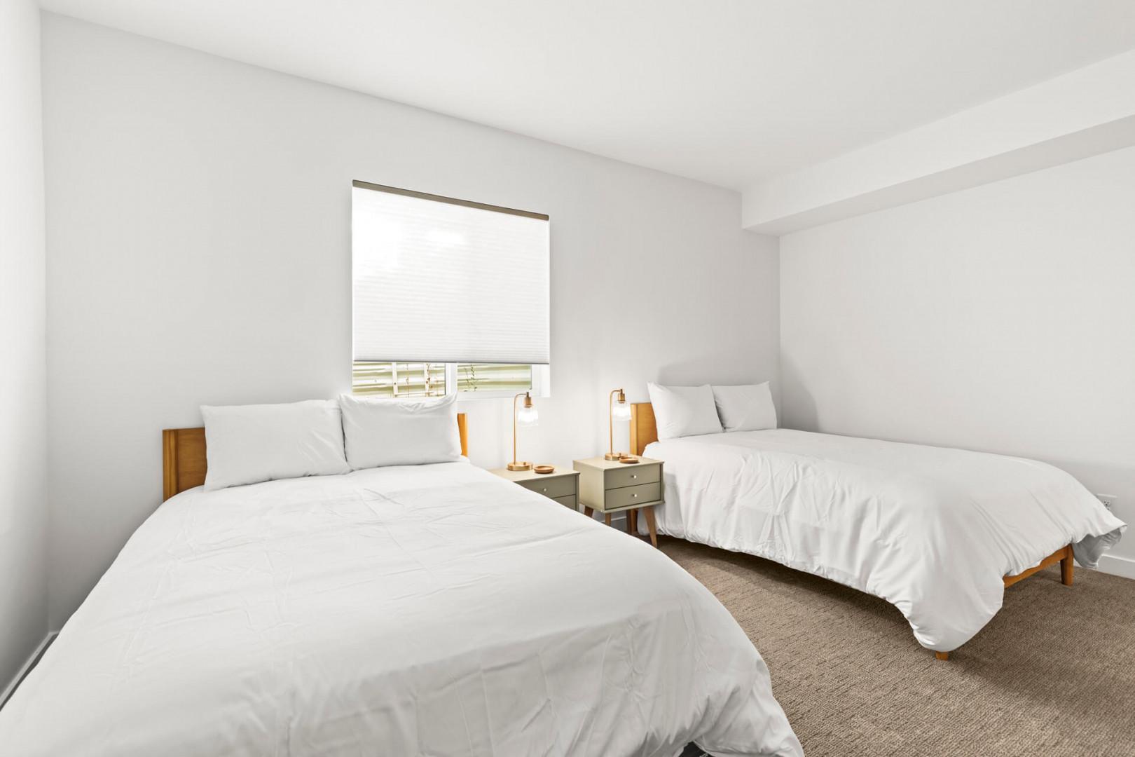 Bedroom 2: Two Full Beds downstairs, small walk-in closet, 1 chest, 1 dresser, 2 bedside tables, and full-length mirror. Perfect for kids or friends, this room offers ample space and storage for all your belongings.