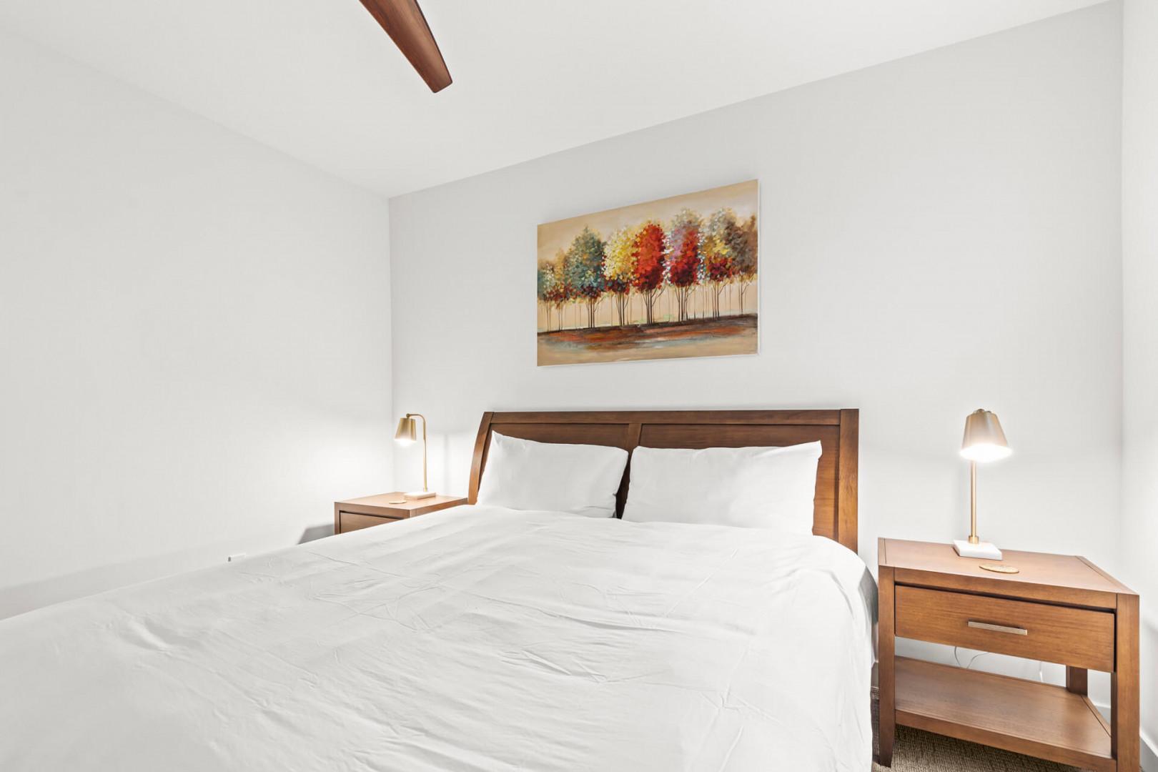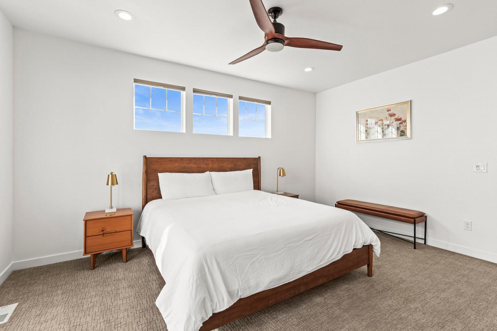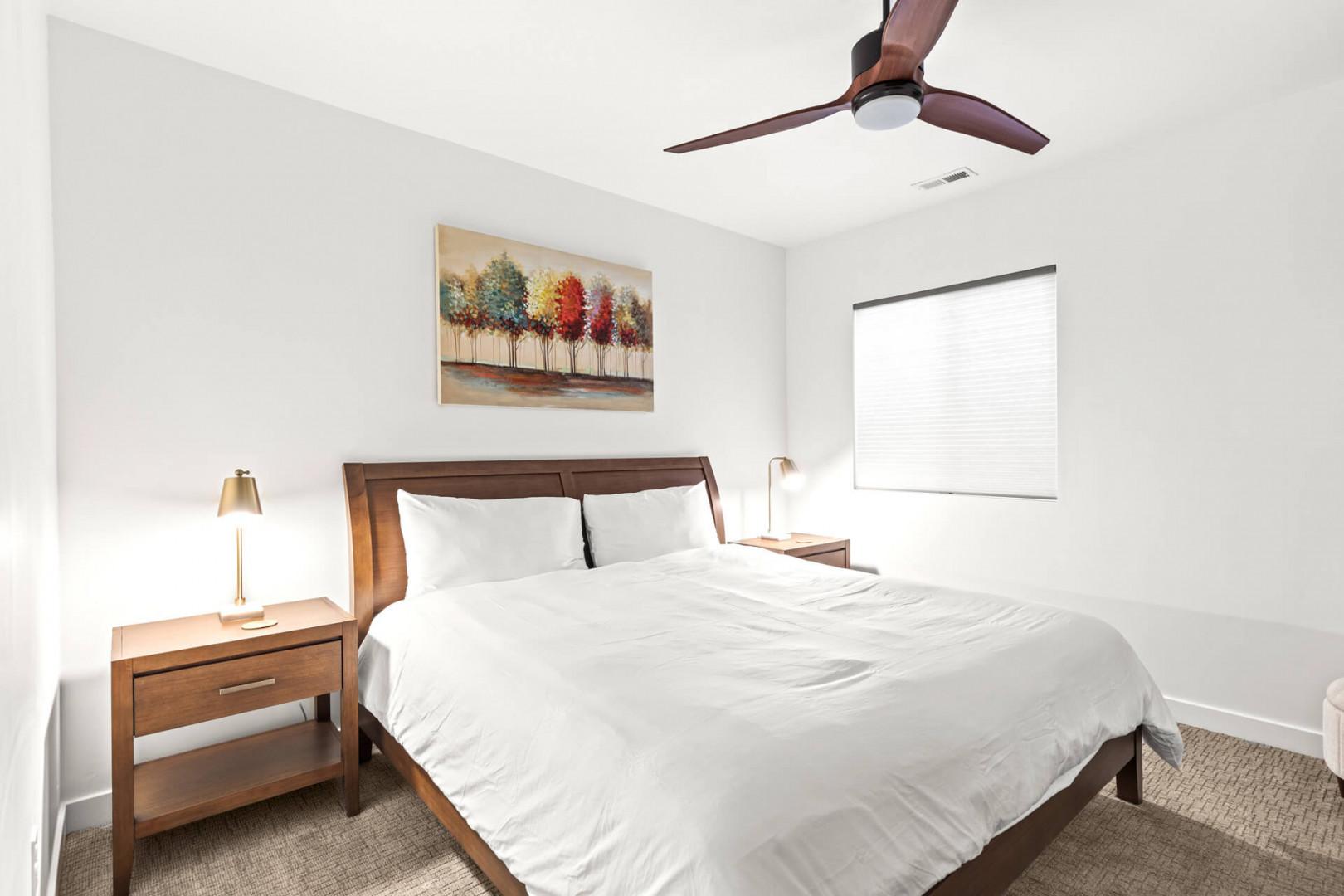 Bedroom 1: King bed downstairs with a 55" Smart TV, ceiling fan, a small walk-in closet, 1 chest, 2 bedside tables, full-length mirror, and stool. This cozy space provides a serene retreat with all the comforts you need for a restful night's sleep.