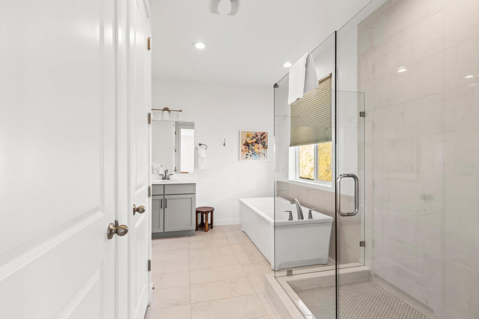 Bathroom 1: Primary upstairs with a separate soaking tub, glass/tile walk-in shower, dual sink vanity, lighted mirror, and hair dryer. The walk-in closet now offers ample storage space.