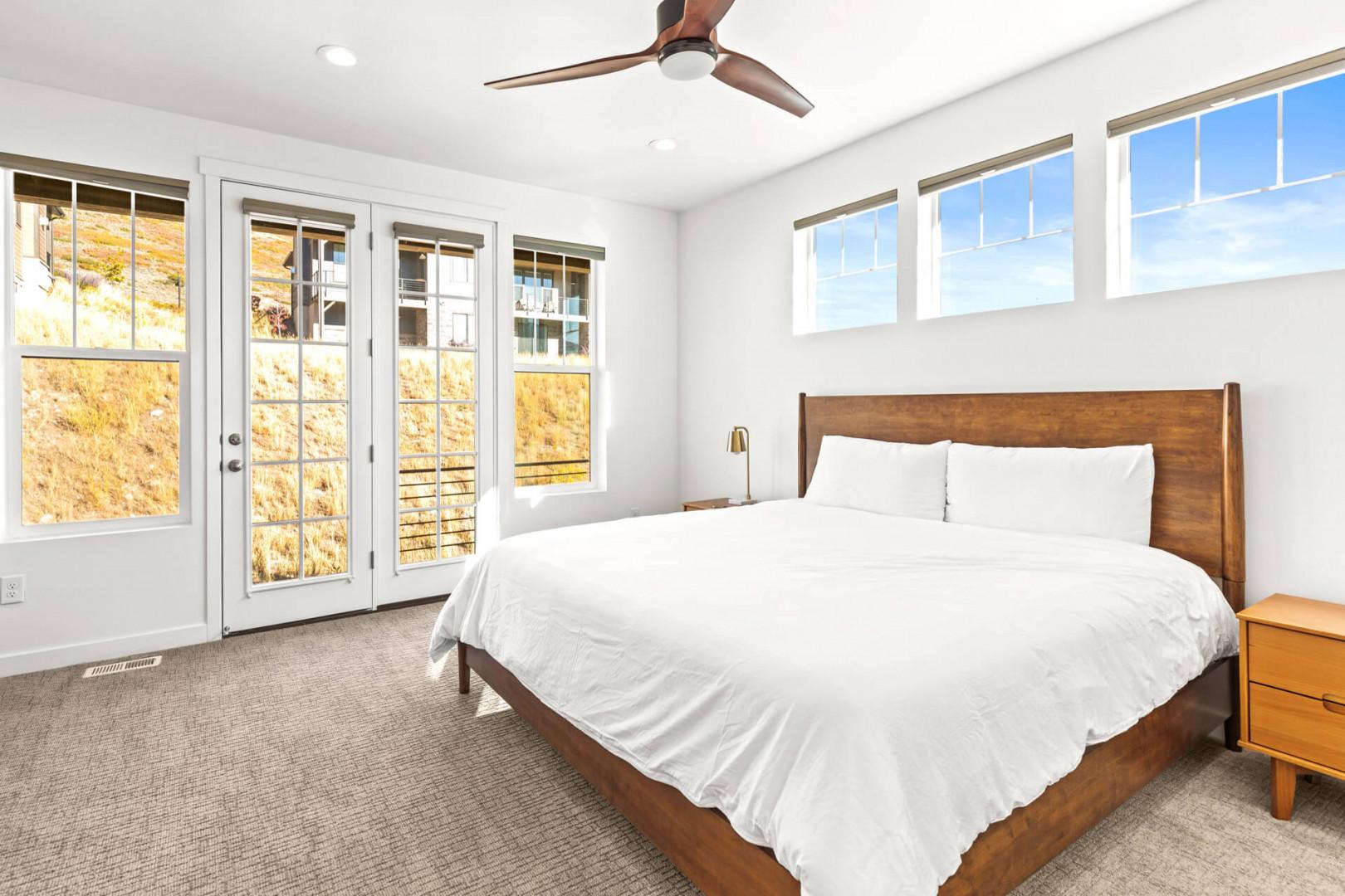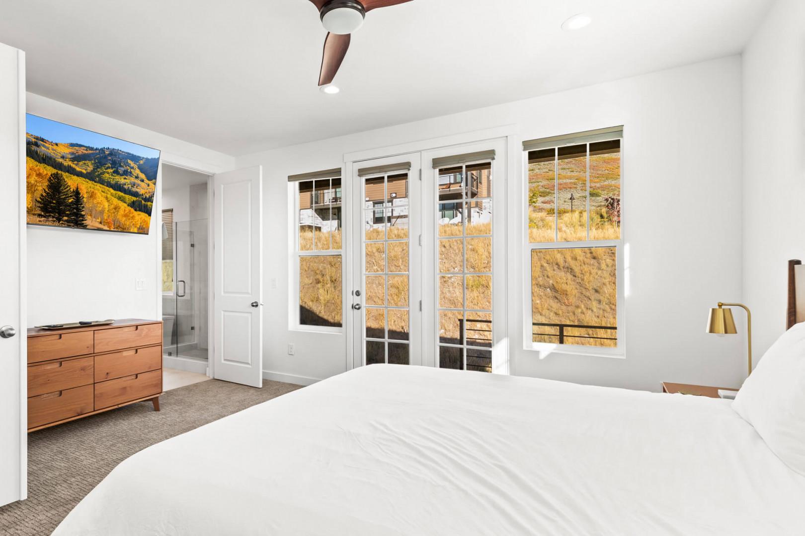 Jordanelle Ridge 499: King bed upstairs with a 65" LGE Smart TV, ensuite bathroom, patio, and ceiling fan