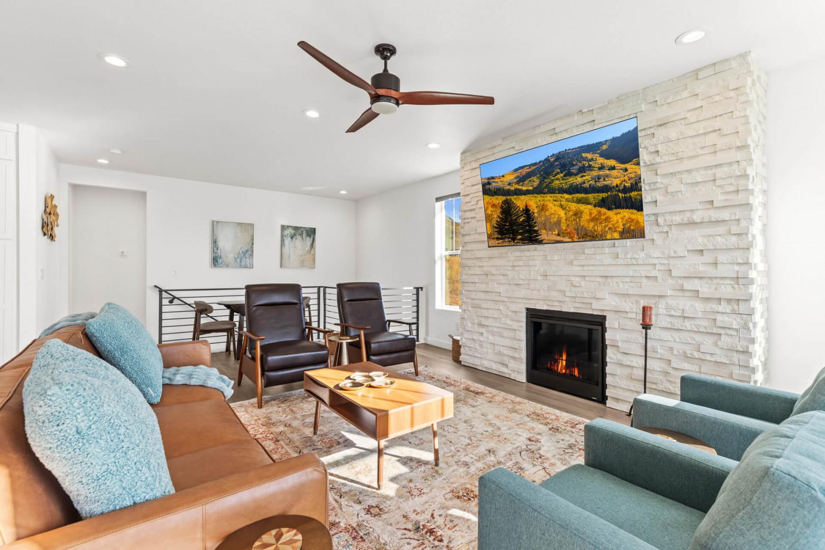 The living room is an inviting space designed for relaxation and socializing. With a comfortable sofa, two chairs, and two recliners, it's perfect for gathering after a day of adventure. Enjoy a movie on the 75" Smart TV or engage in friendly competition with cards and board games. A game/puzzle table with two chairs adds a touch of fun, making it a favorite spot for guests of all ages. Accommodations include a plush area rug and oversized toss pillows for kids to enjoy a comfortable free-form play space in front of the fireplace where they can play video games or watch a movie. Additionally, step out onto the balcony off the living area to find 2 outdoor Adirondack rocking chairs and a table, perfect for taking in the amazing views and fresh mountain air.