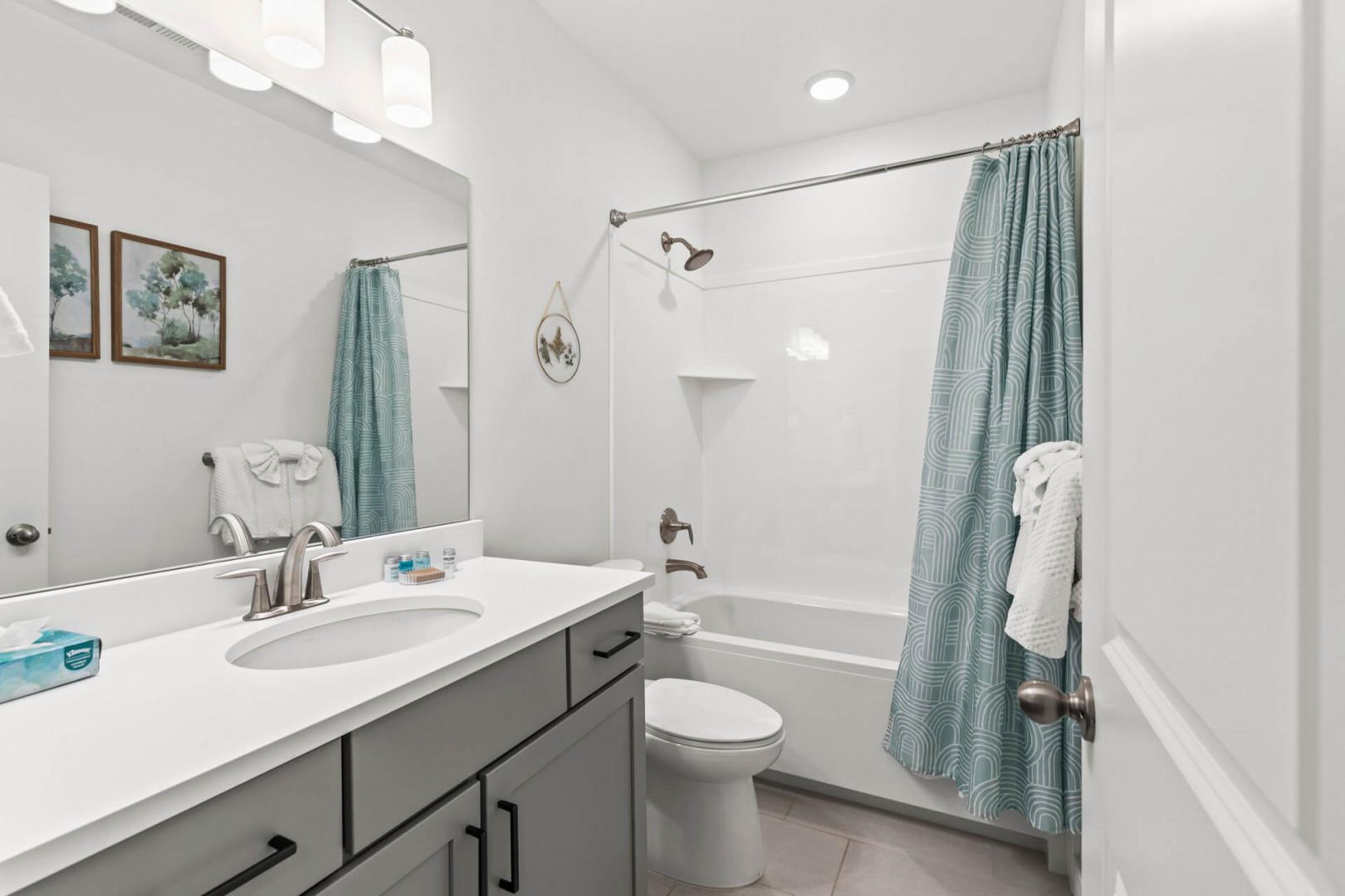 Bathroom 2: Downstairs shared bathroom with a tub-shower combo and hair dryer. To make getting ready for a night on the town easier for guests staying on the first floor, accommodations include a small vanity and magnified mirror in the well-lit large laundry room adjacent to the full bath.
