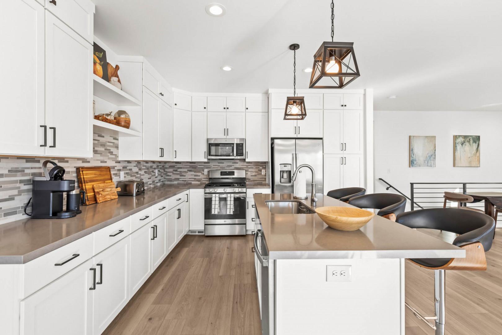 Our fully equipped kitchen is a culinary dream. Whether you're whipping up a quick breakfast or a gourmet dinner, you'll find everything you need, from cookware and dinnerware to a coffee maker and griddle. The oven and stove are gas, ensuring precise cooking control. The sideboard offers ample storage for large platters and bowls. Enjoy meals together at the dining table with seating for 8, or grab a quick bite at the bar with seating for 3. Take in expansive, breathtaking mountain views while you enjoy morning coffee or a glass of wine rocking in the two Adirondack chairs on the balcony.