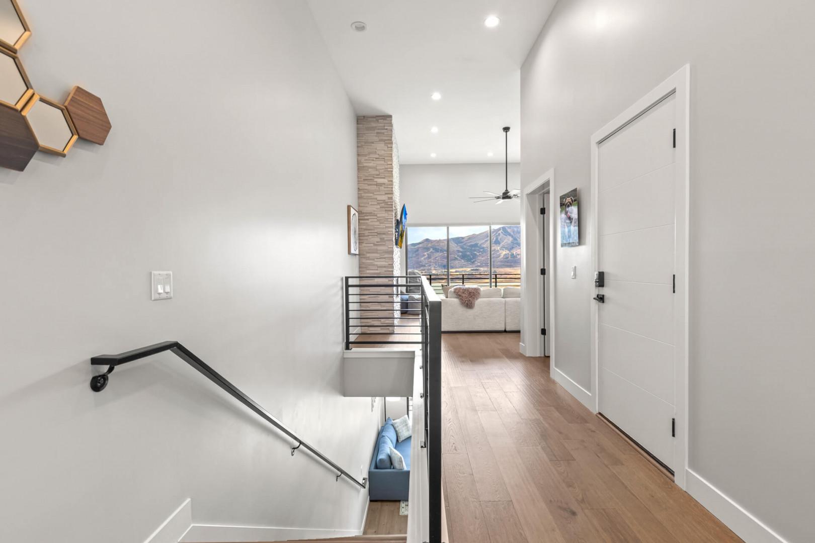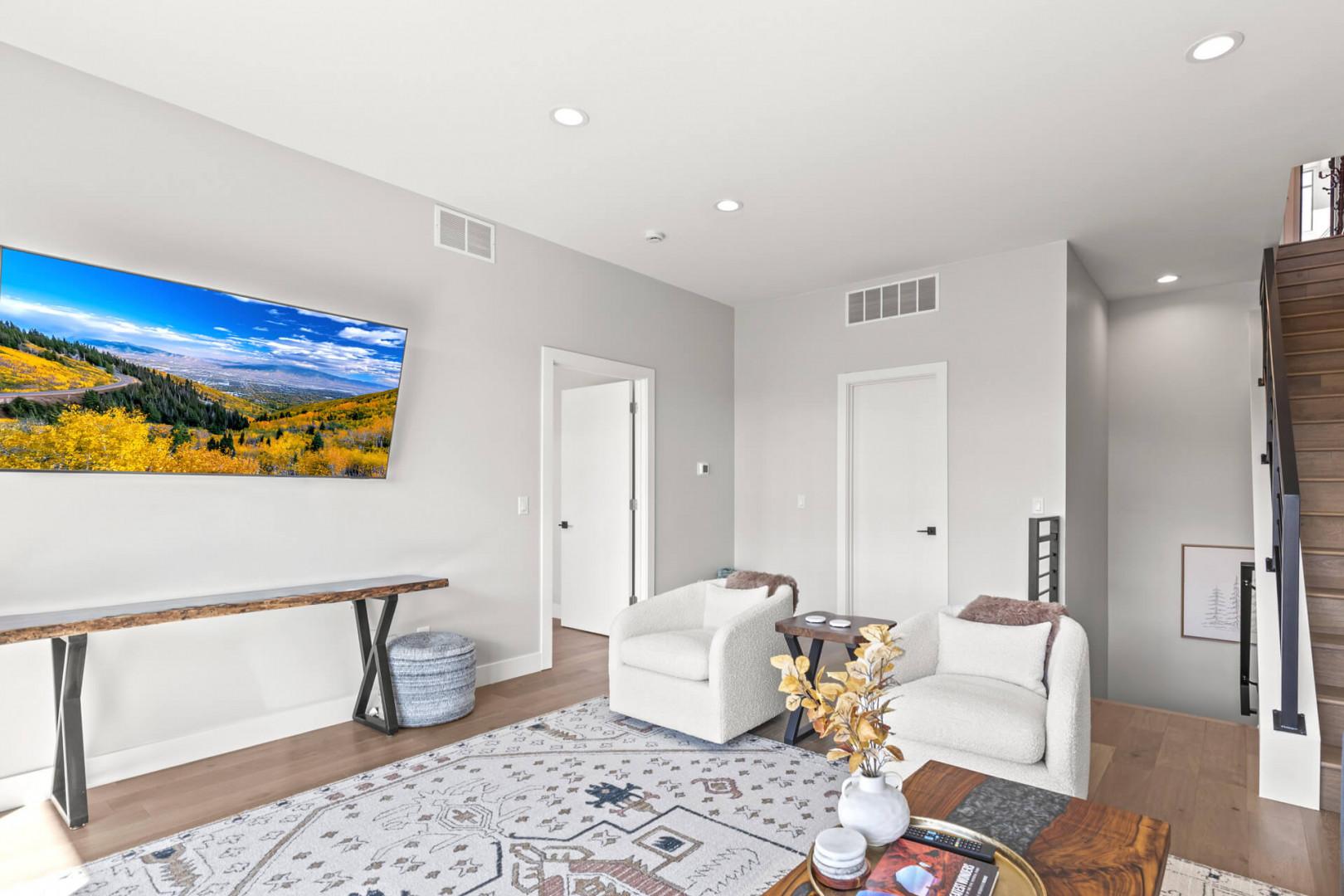 On the mid-level, enjoy balcony access complete with seating and throw blankets. This area hosts another 65" Samsung TV and a PlayStation 5, ideal for gaming nights or movie marathons. The balcony offers stunning views and is a perfect spot for morning coffee or evening relaxation. The mid-level living room's cozy ambiance makes it a favorite spot for guests seeking a quiet retreat within the home.