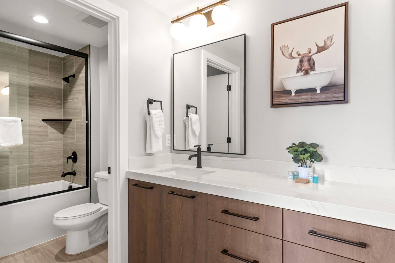 The shared bathroom on the third level offers a tub/shower combo, dual sink vanity, and hair dryer, ensuring comfort and convenience for guests in Bedrooms 2 and 3.