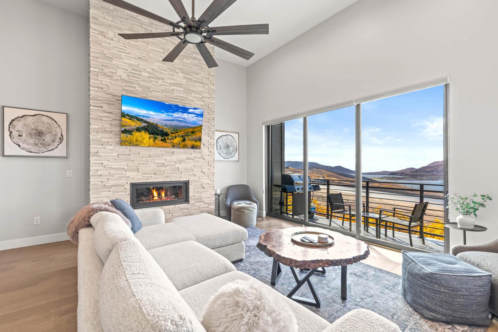 Klaim Retreats 822: Main Living Room with Gas Fireplace, Bright Windows with Views of the Lake and Mountains