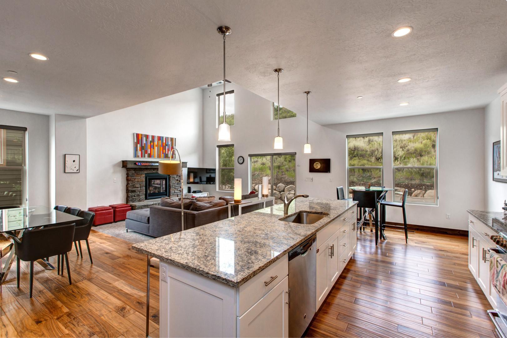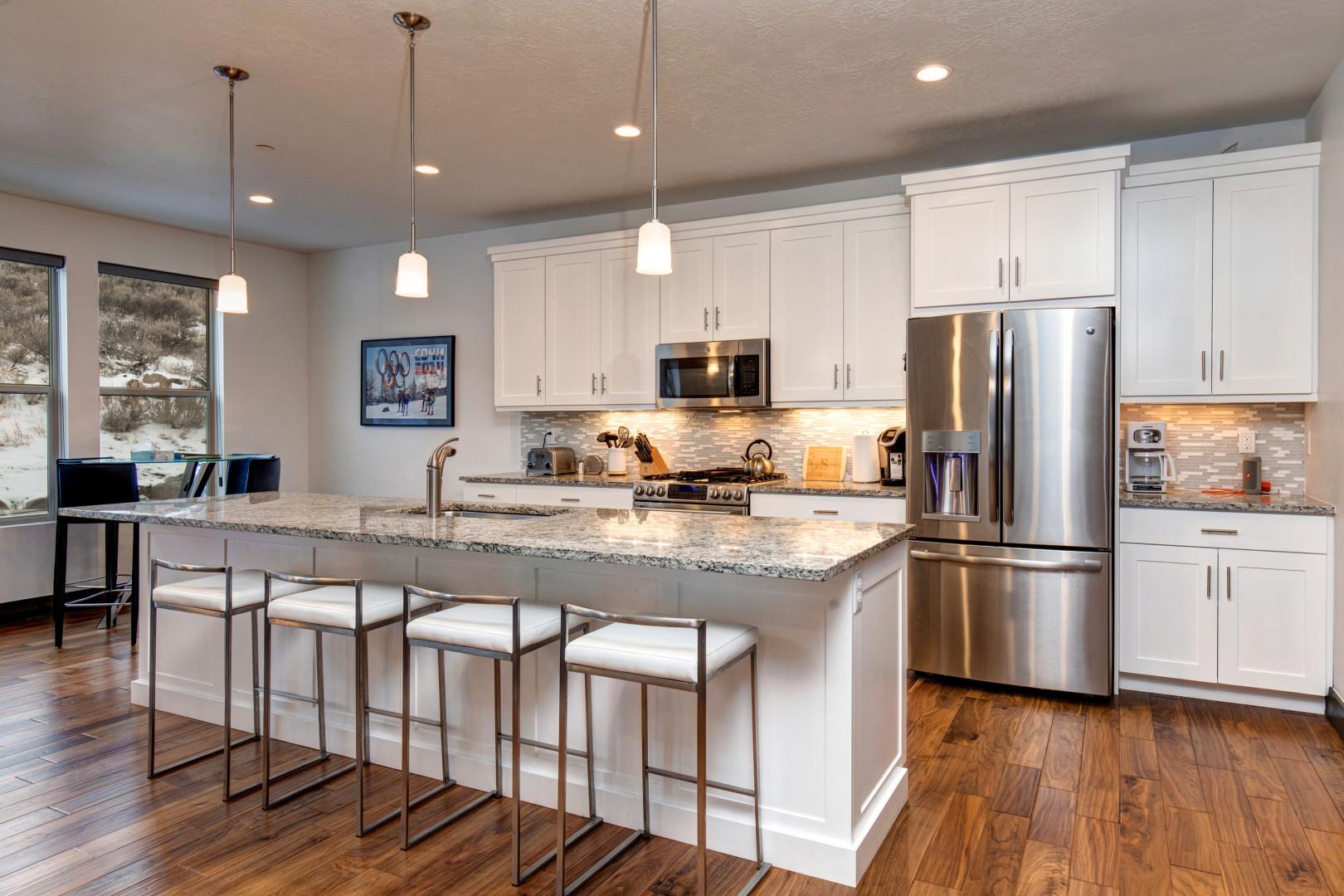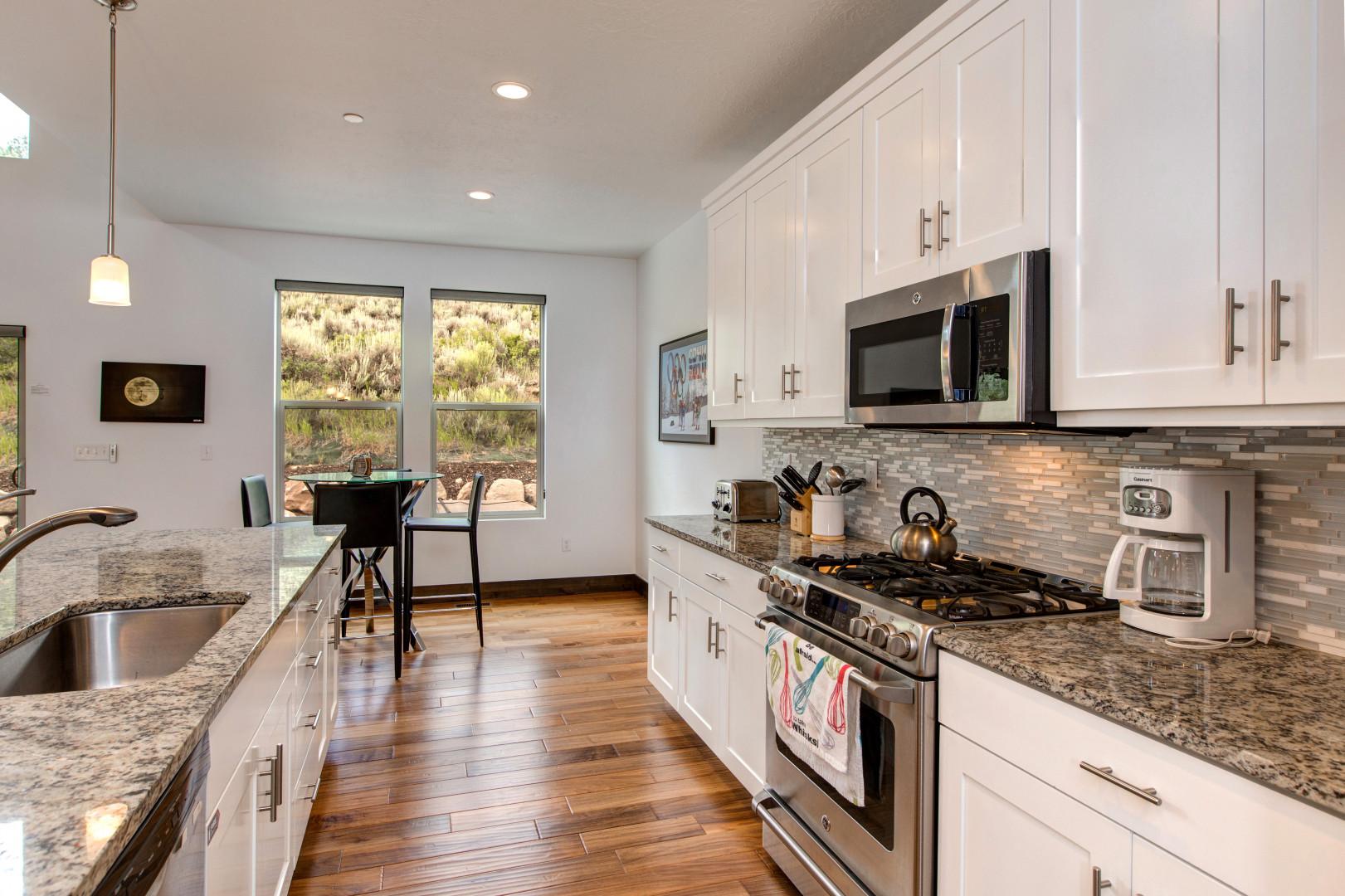 When you arrive at this large, duplex-style townhome, you’ll walk in on the main level into a large great room. The living room has plenty of seating and has a 46” HD Smart TV with DirecTV satellite programming. There’s a luxurious gas fireplace close to the seating for cold winter nights. The large windows provide plenty of light and enhance the new, modern décor of the room. The patio is located just off the living room where you’ll find a private hot tub for relaxing the nights away and a gourmet gas BBQ grill.