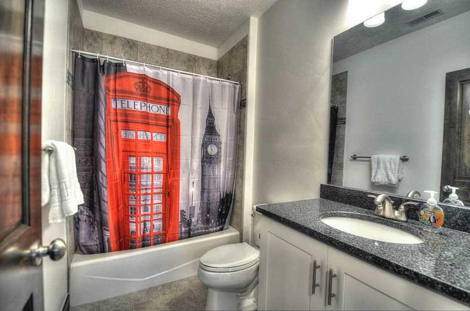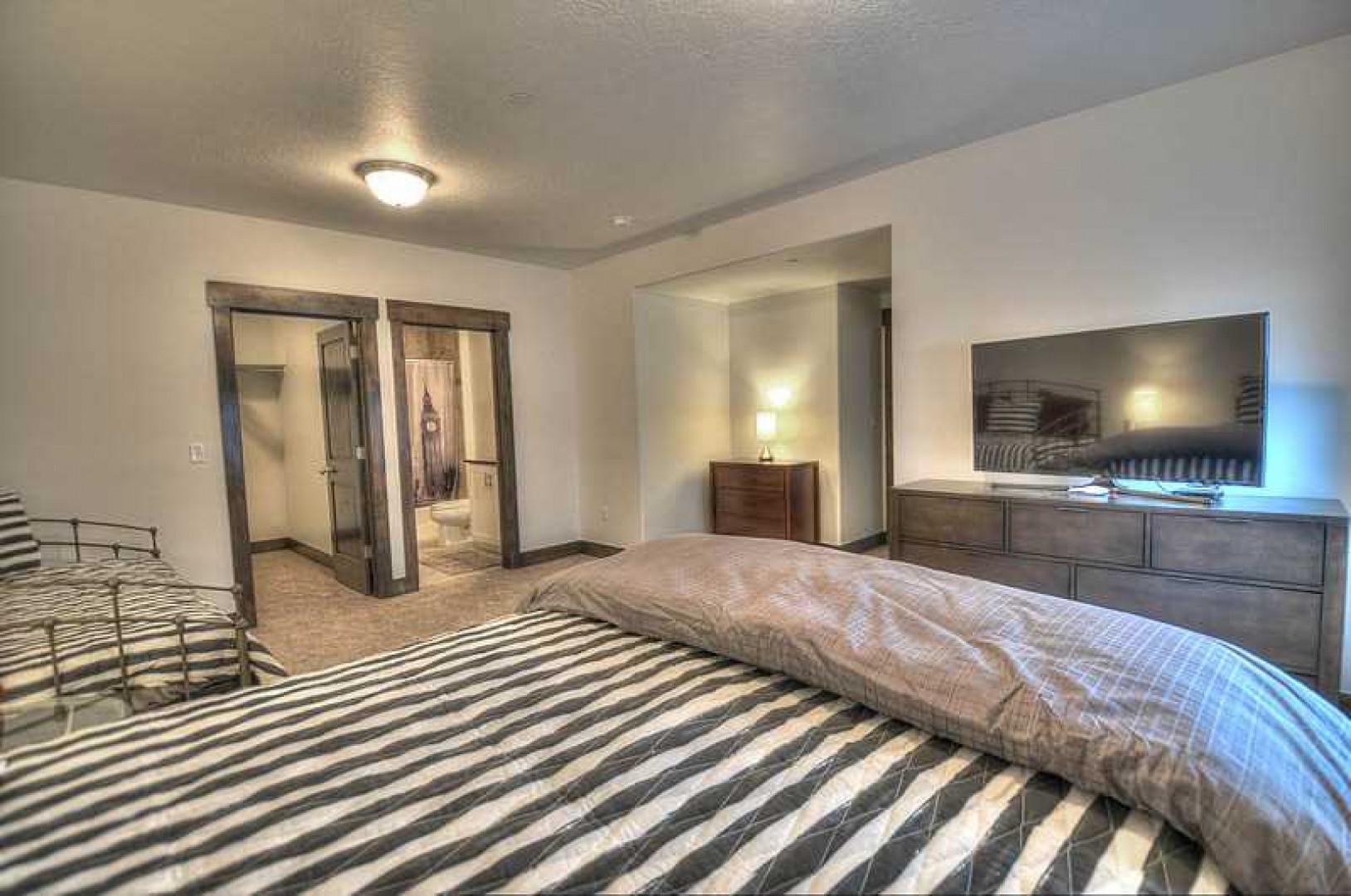 On the lowest level of the home, you’ll find another bedroom with an attached full bath (tub/shower combination). There’s a Queen-sized bed, a Twin-sized bed with Twin trundle, and 48” HD Smart TV in the considerably-sized room. In the closet at this level is a Pack-N-Play and highchair.