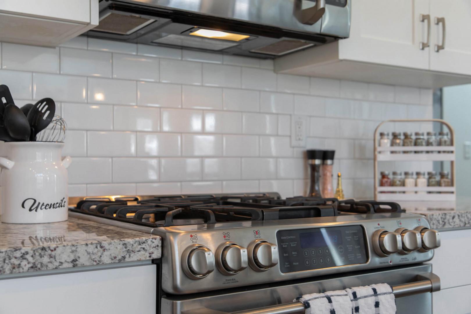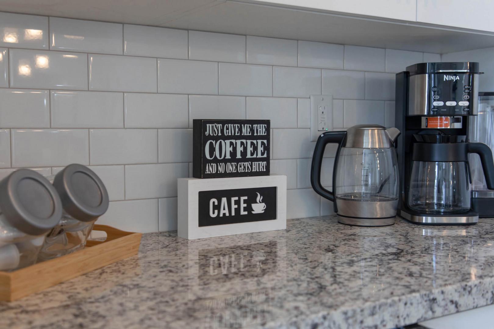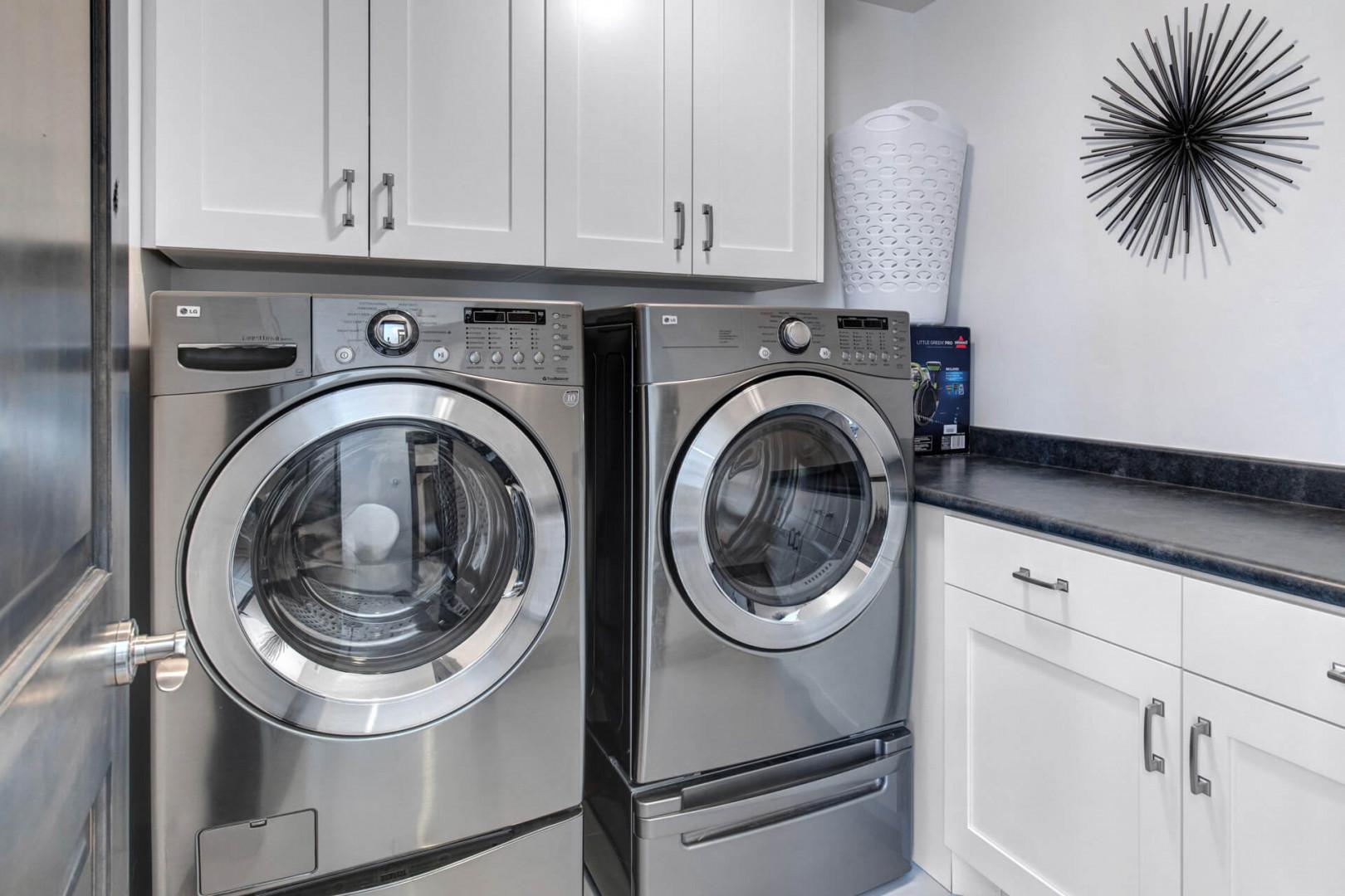 As you step inside, you are immediately enveloped in an atmosphere of warmth and sophistication. The expansive living room, with its inviting seating arrangement, is centered around a grand gas fireplace, creating the perfect setting for cozy evenings. An 85" LG Smart TV, equipped with an Amazon Firestick and ZVOX Sound Bar, ensures that entertainment is just a click away. Adjacent to the living area is a spacious dining room, where a table seating 10 and bar seating for four invite you to enjoy meals and conversations in style. The fully equipped gourmet kitchen is a culinary masterpiece, featuring everything from an air fryer to a wine fridge, ensuring that every meal is a gourmet experience.