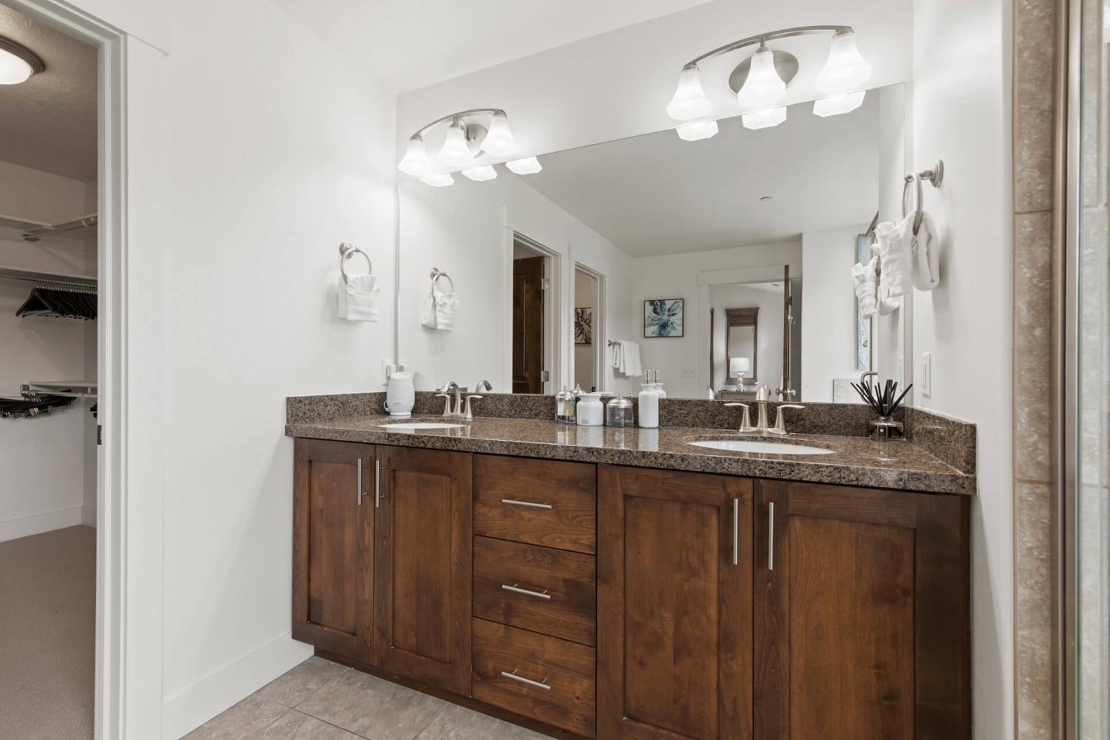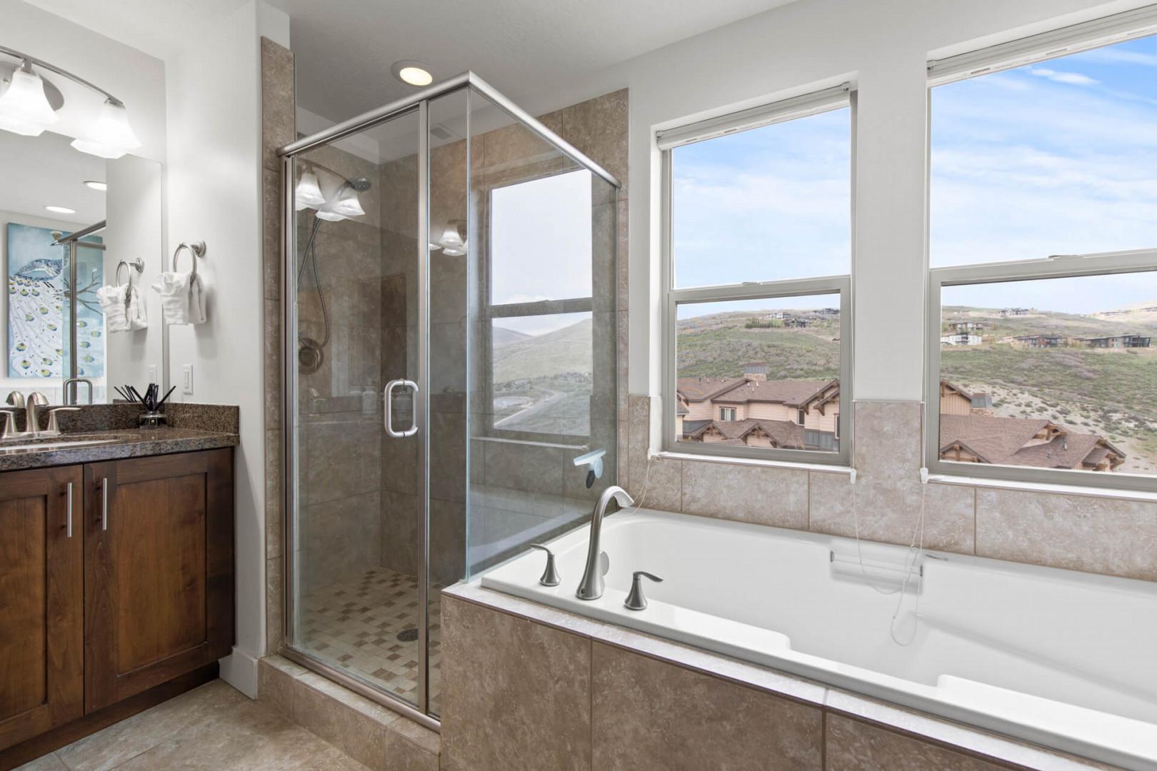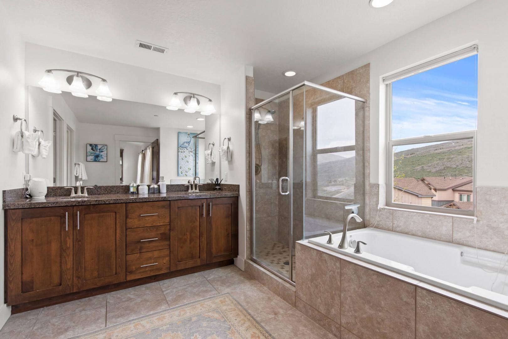 Primary Ensuite (Upper Level): Includes a double vanity, soaking tub, and step-in shower.