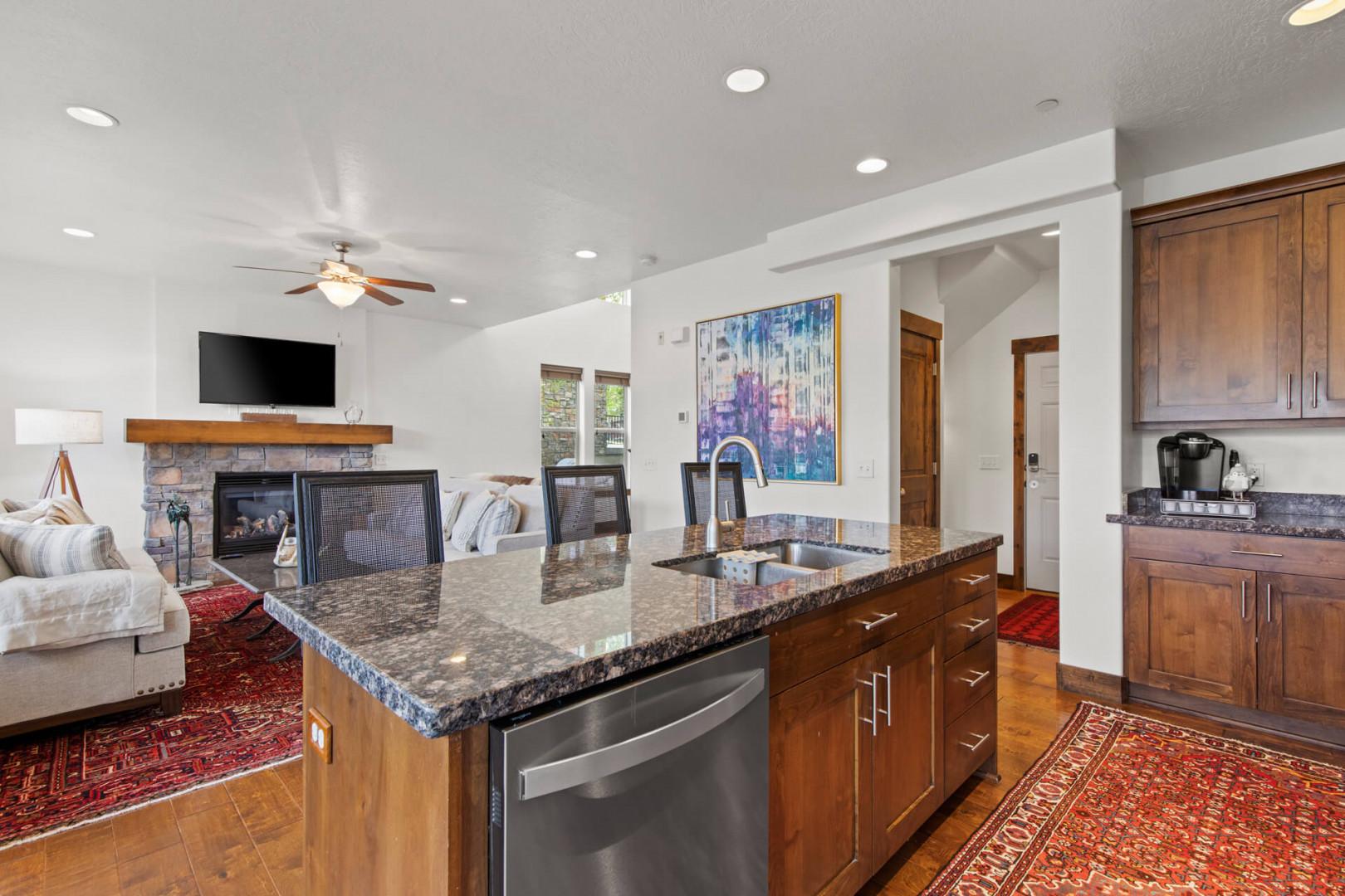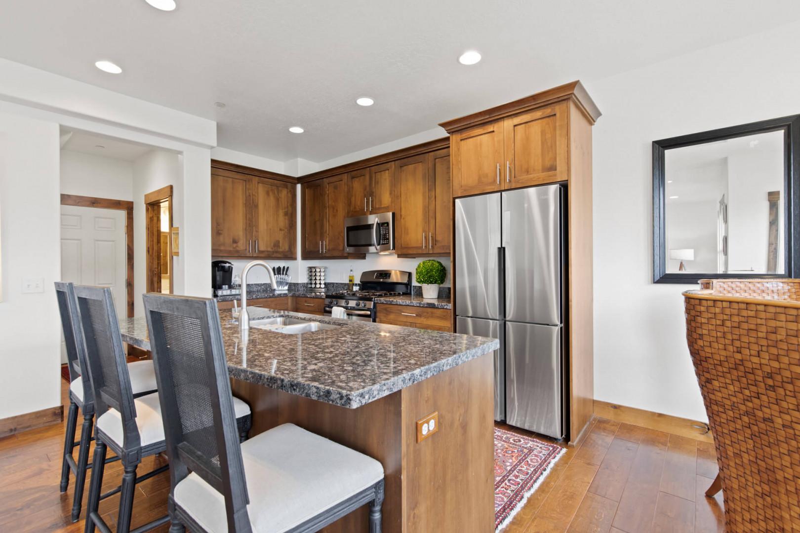 The main level of this mountain oasis is wide open, featuring a spacious living area with two plush sofas that face one another, creating a perfect spot for entertaining and socializing. There’s a cozy stone fireplace for chilly mountain evenings and a large HDTV for streaming your favorite shows. Bright, sunny windows overlook the surrounding mountain views, and there’s also a convenient powder room nearby. The open kitchen features natural wood cabinets, sleek granite countertops, and premier stainless steel appliances, including an electric range, microwave, dishwasher, and refrigerator. A formal dining table and bar stool seating at the island provide plenty of space for your whole crew.