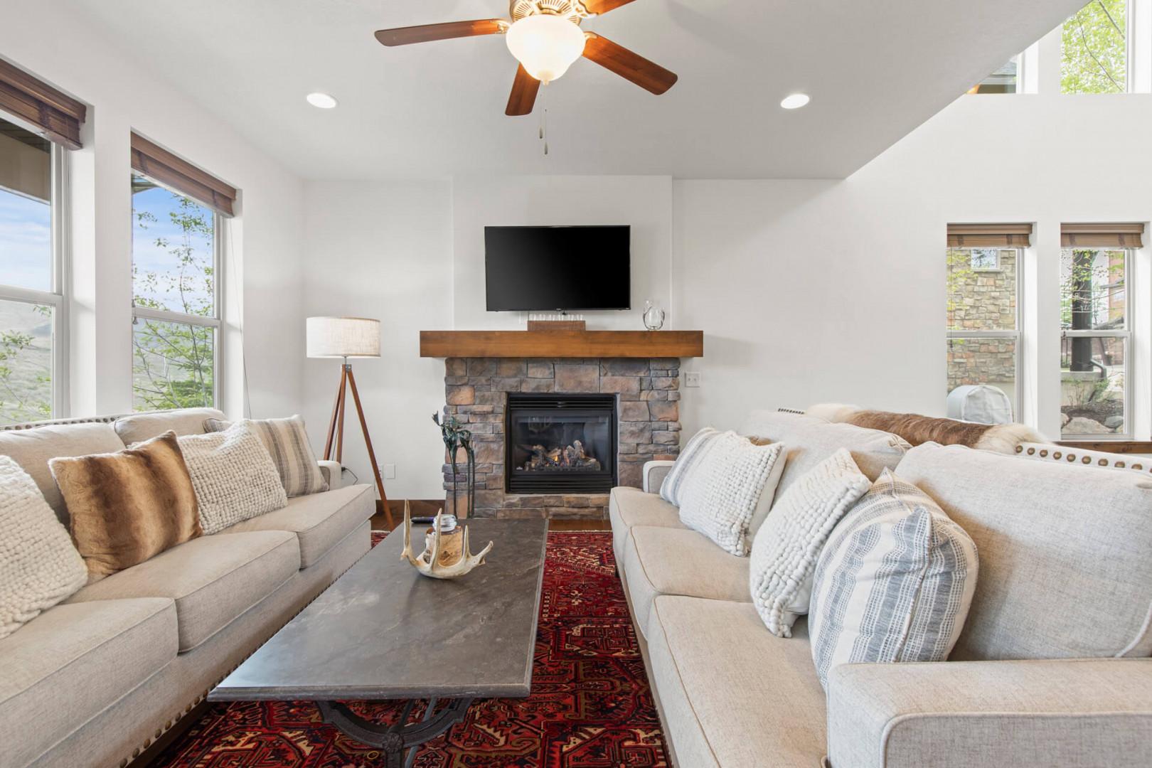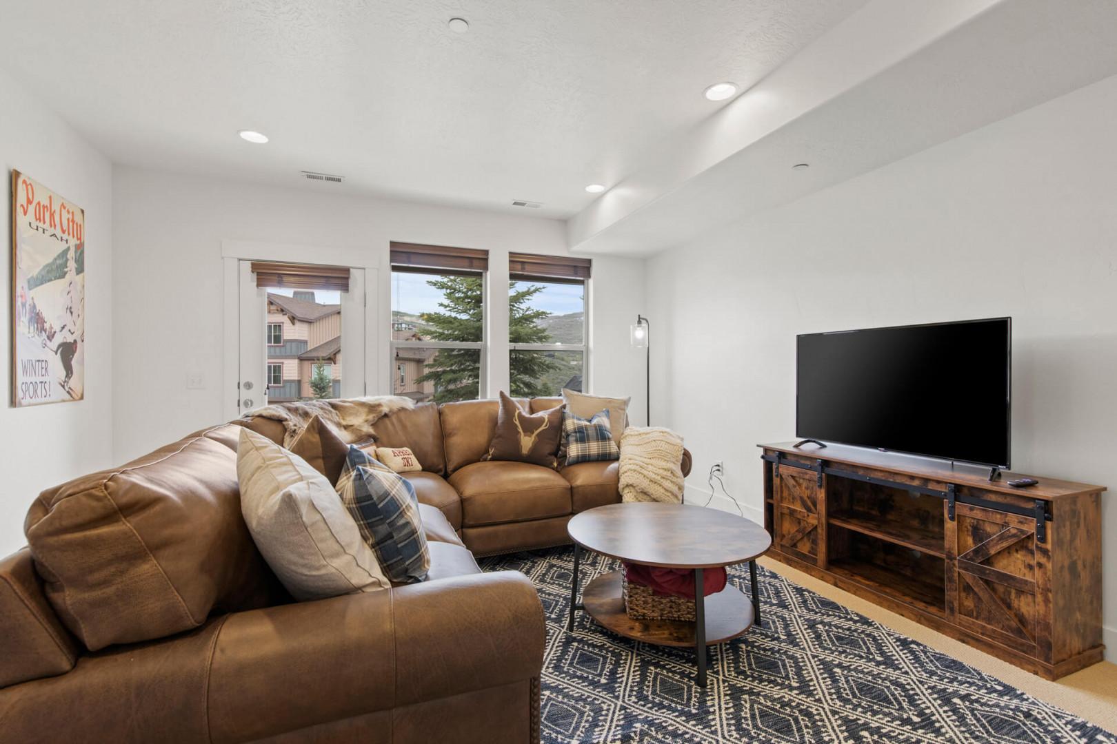 Downstairs on the lower level, there’s a secondary living area with a leather sectional sofa and an HDTV, perfect for cozy movie nights.