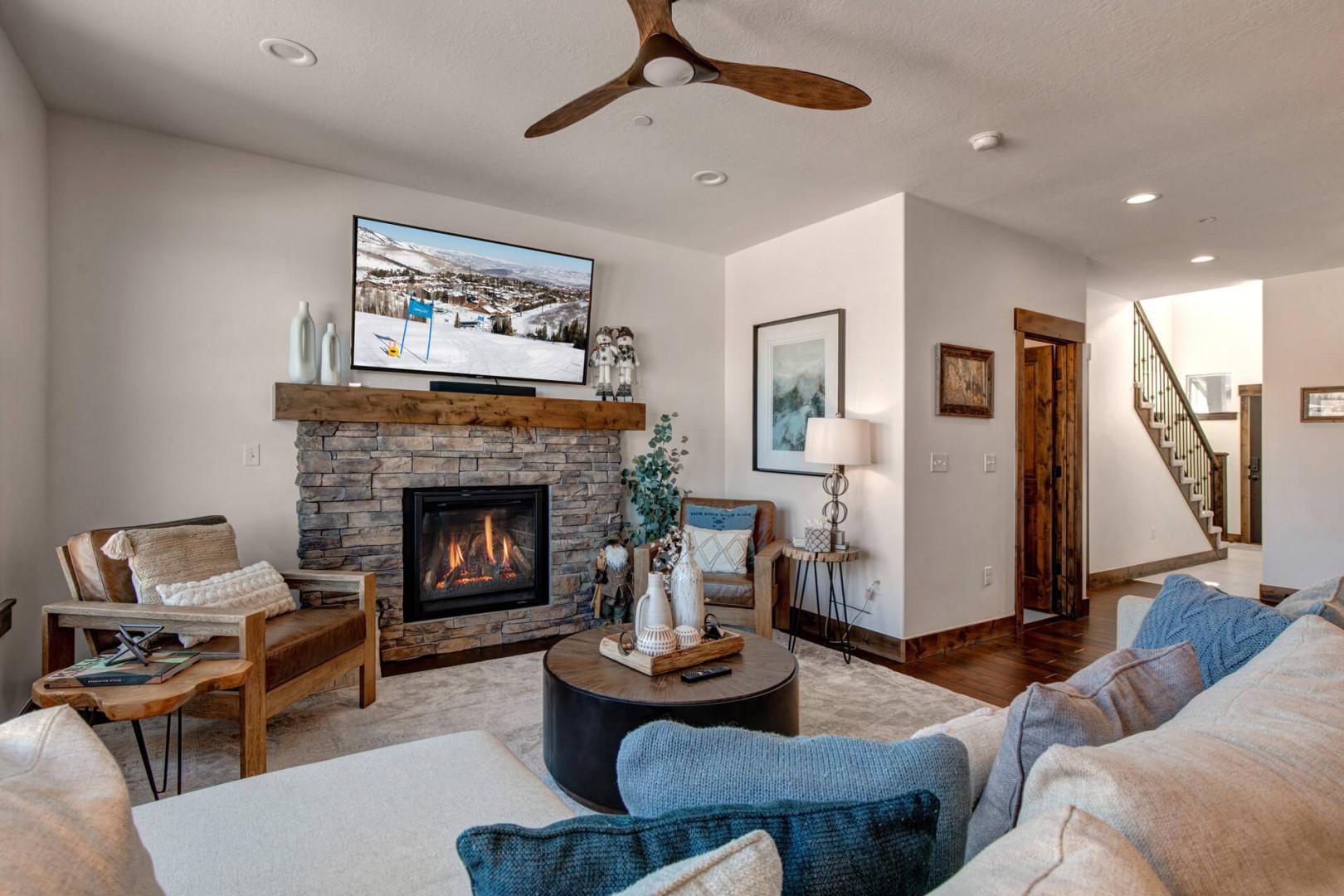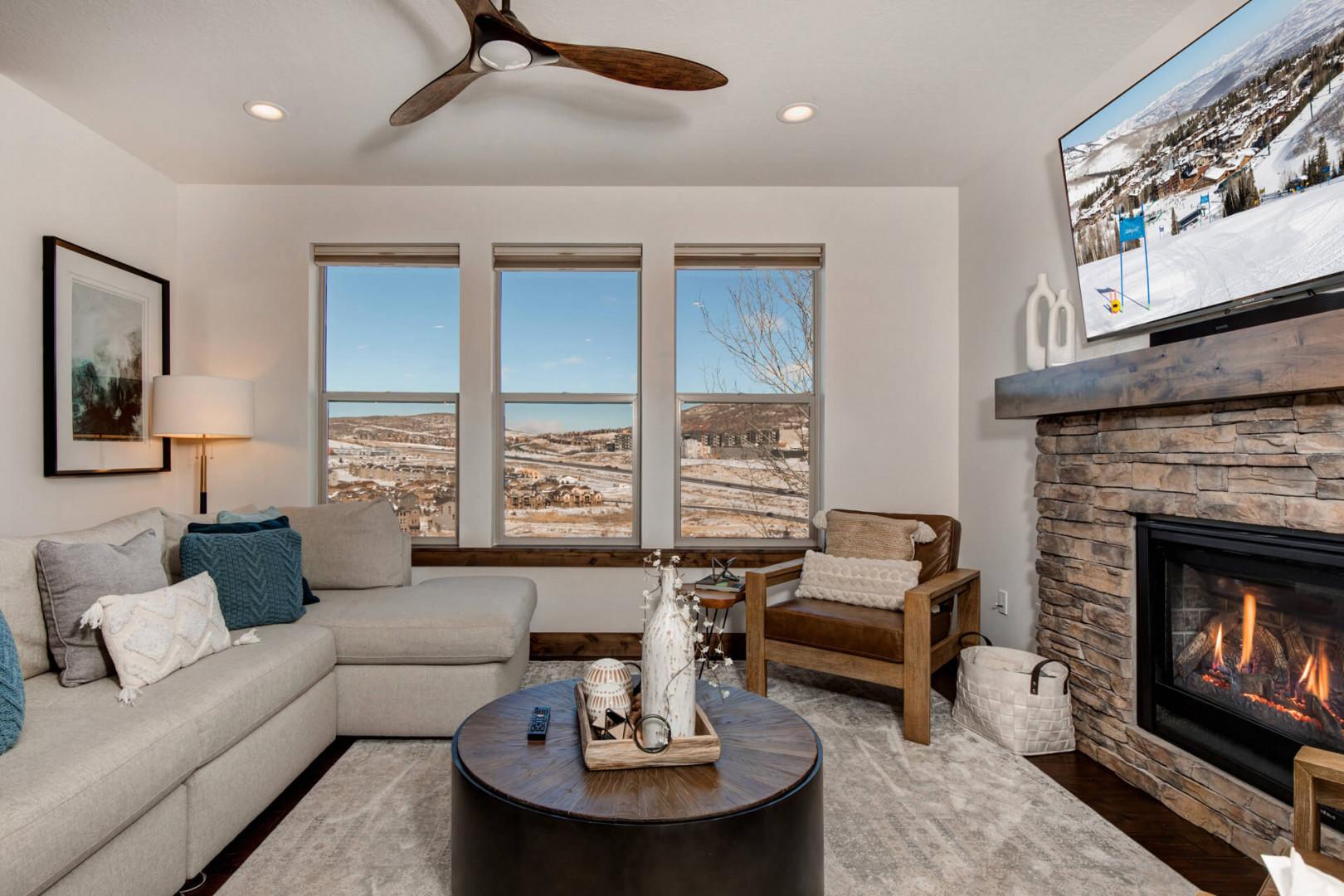 Retreat at Jordanelle 906: Main level living room with TV and gas fireplace