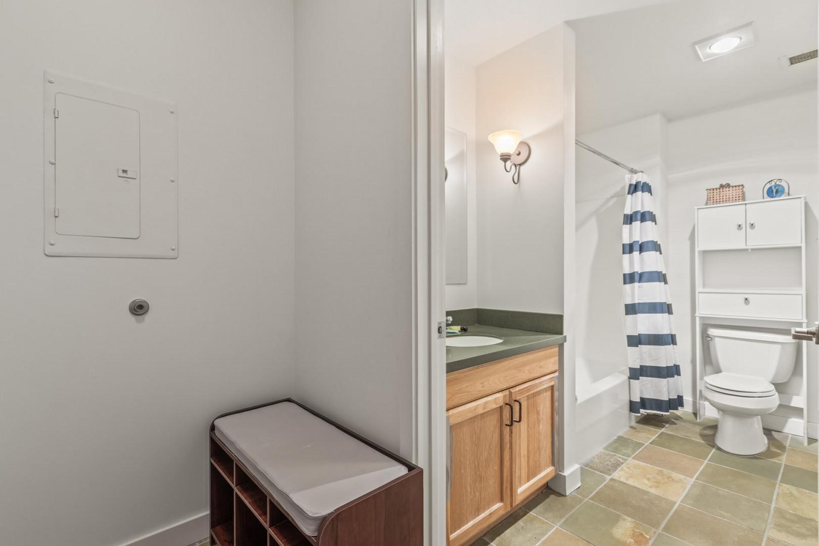 Heated GARAGE parking is incredibly convenient, and the elevator will take you up to your front door. Once inside, the well-designed space begins with a spacious, FULL-SIZE BATHROOM that includes a single vanity sink and a tub/shower combo. Elegant ceramic tile floors are highlighted by a striking red accent wall in the hallway.