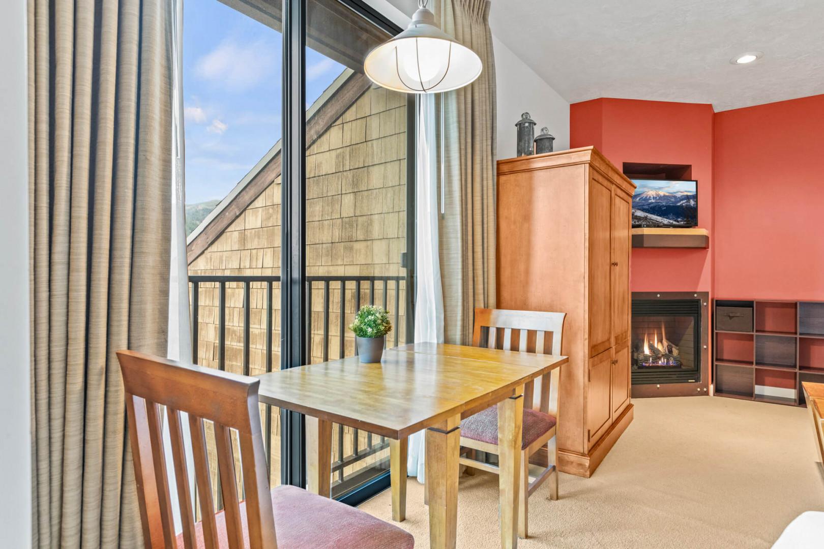 The LIVING AREA consists of an overstuffed leather and fabric sofa— which easily pulls out into a queen/full-size bed— that sits facing the incredibly cozy corner fireplace and 32-inch HDTV. There’s also a DINING TABLE that sits in front of the large window overlooking the gorgeous mountain range in the distance.