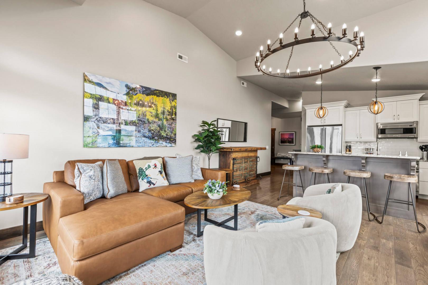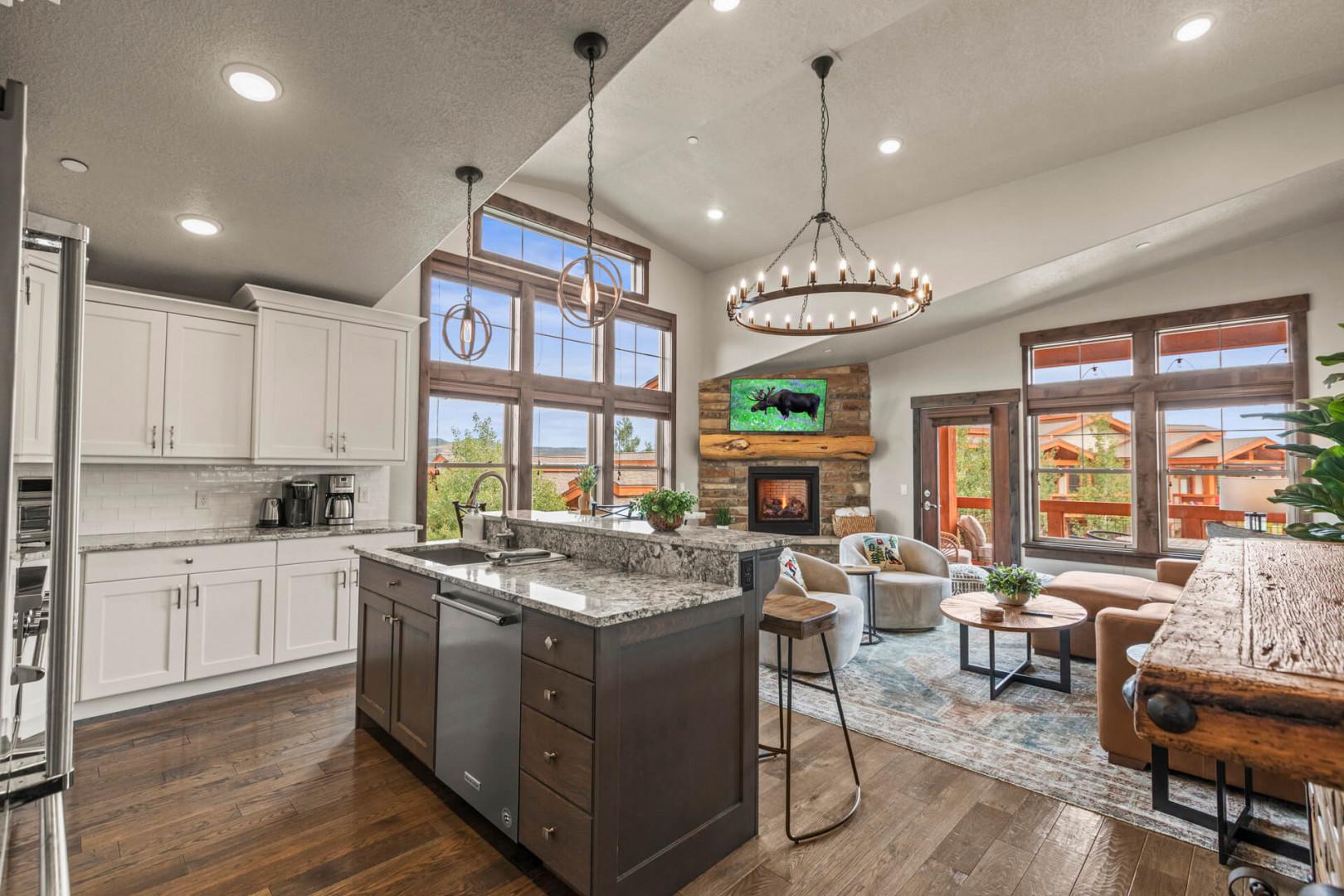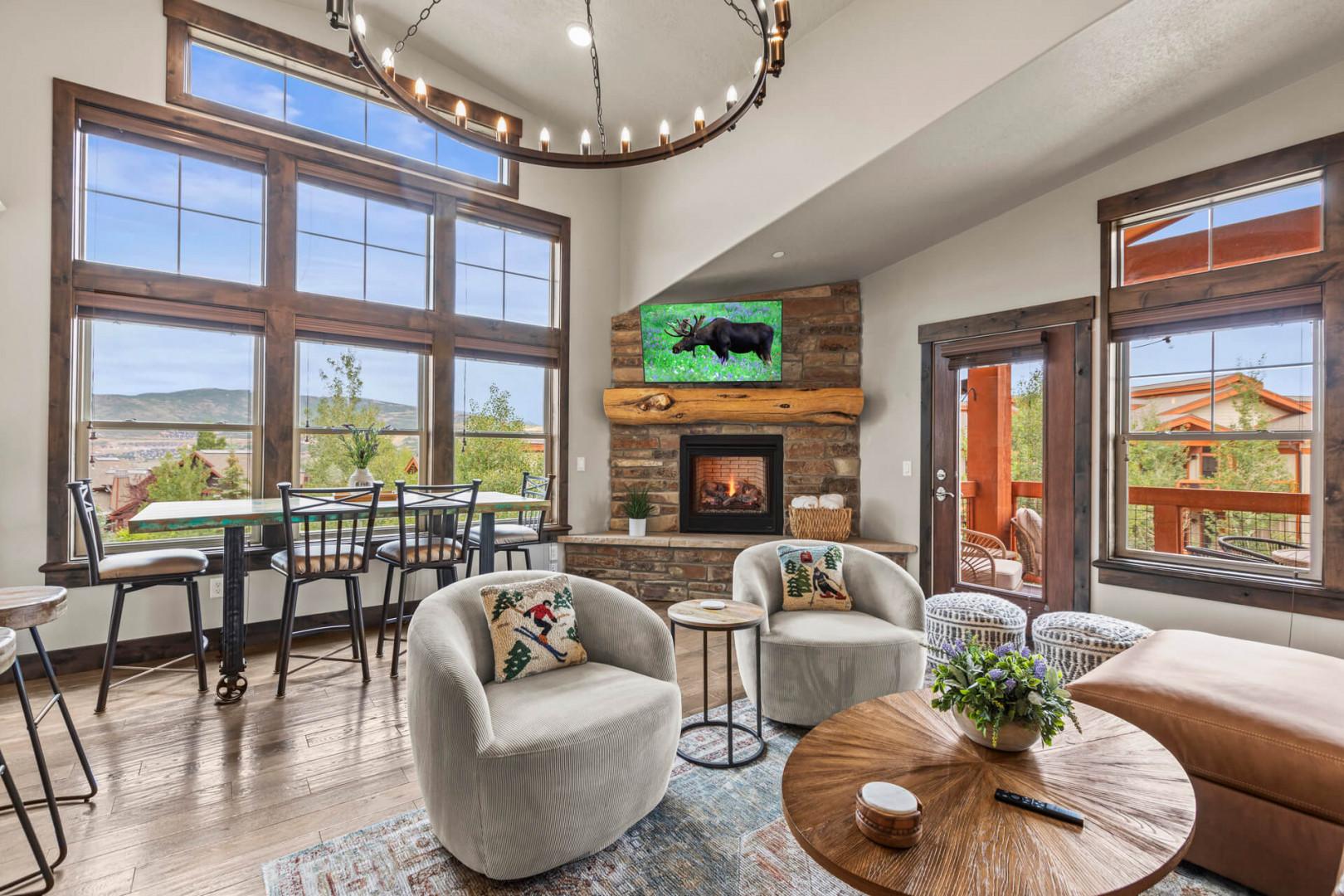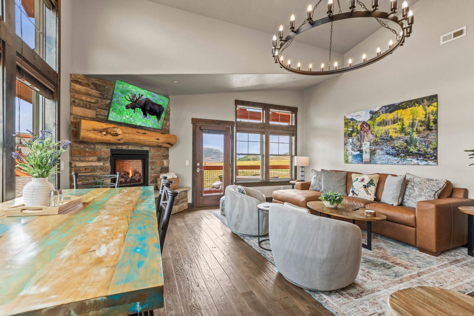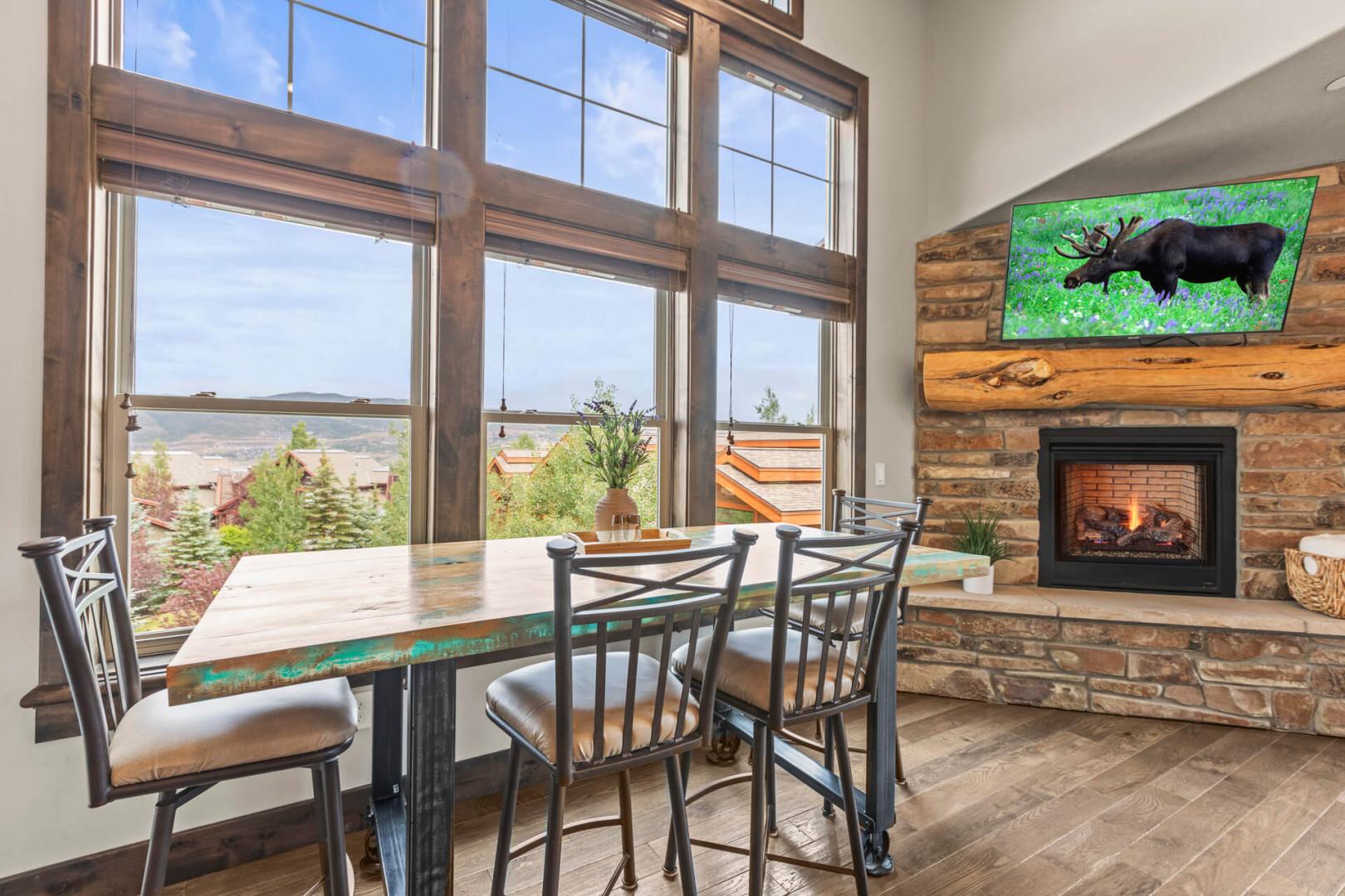 At the heart of this mountain retreat is the living area, where style meets function. A large sectional sofa invites you to gather around the gas fireplace, creating an ideal spot for cozy evenings. The smart TV offers endless entertainment options, while a selection of board games ensures there's something for everyone to enjoy.