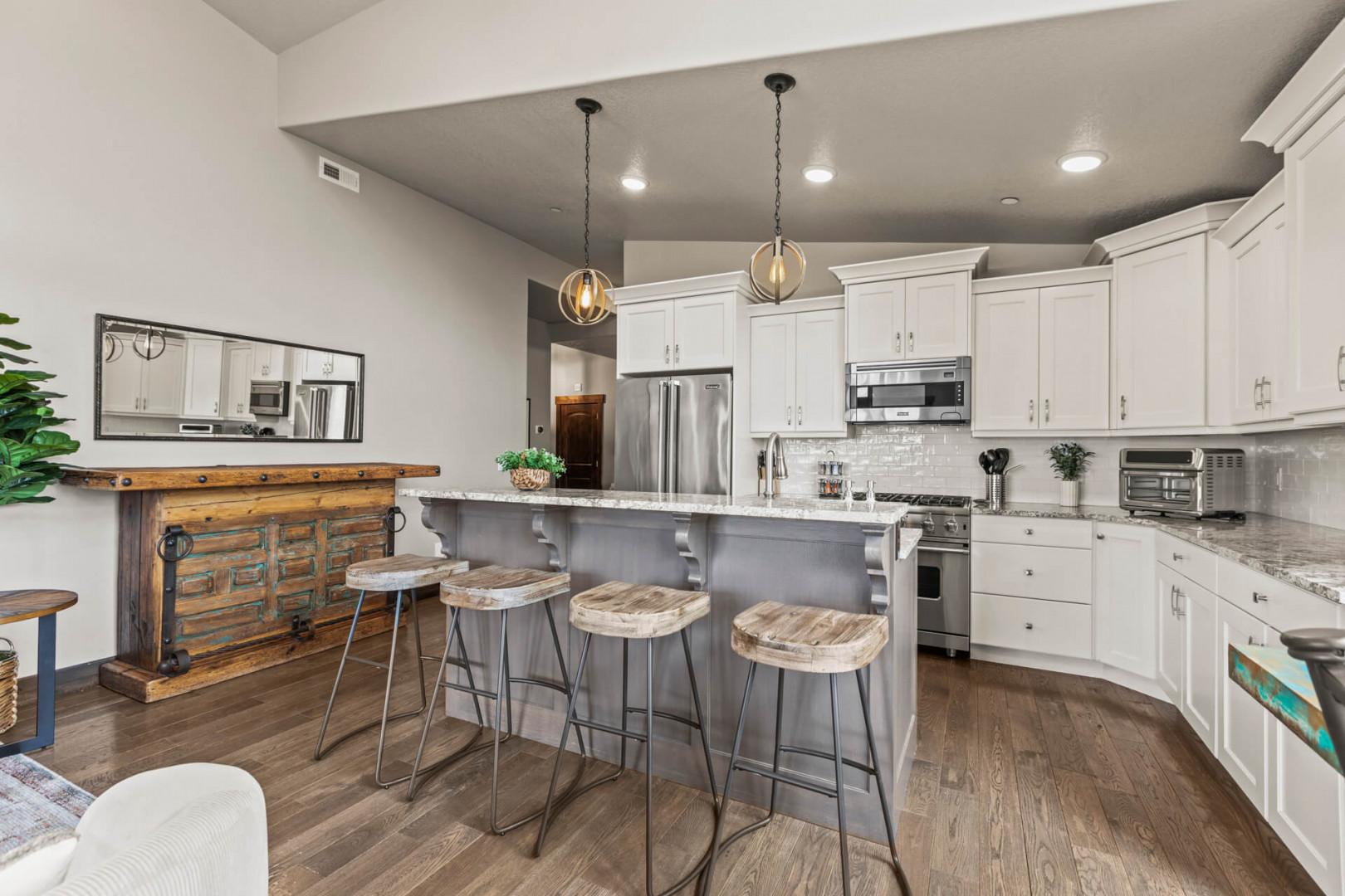 The fully equipped kitchen is a chef's dream, boasting modern appliances and elegant countertops. Whether you're preparing a quick snack or a gourmet meal, you'll find everything you need. The dining table seats four, with additional seating at the kitchen bar, creating a perfect setting for shared meals and laughter.
