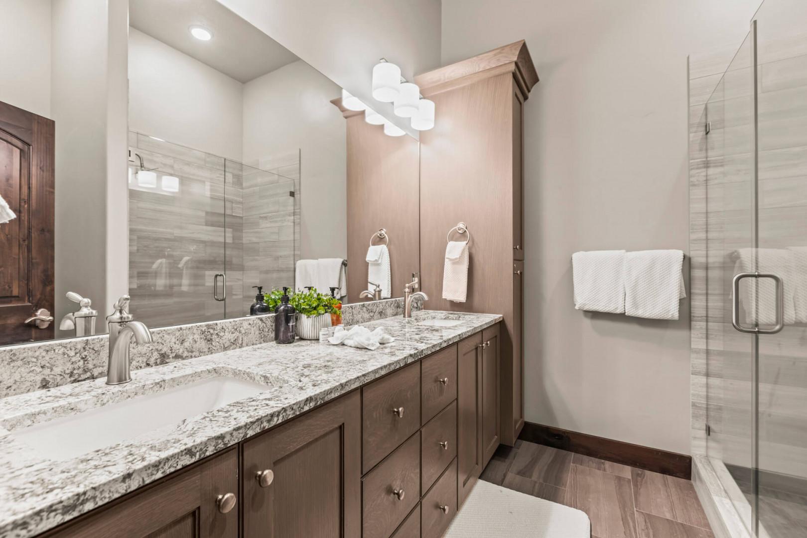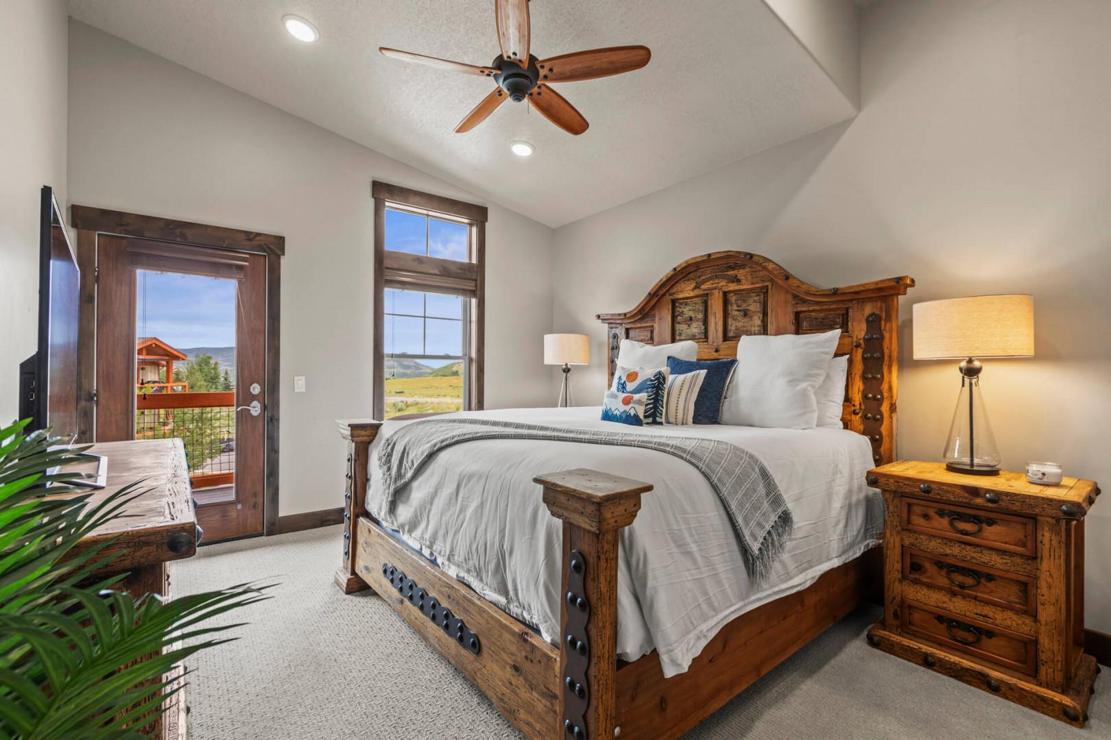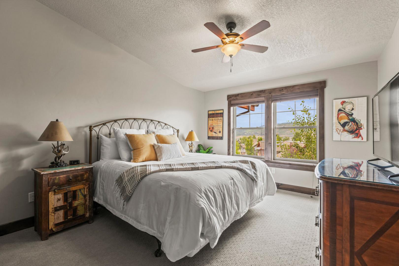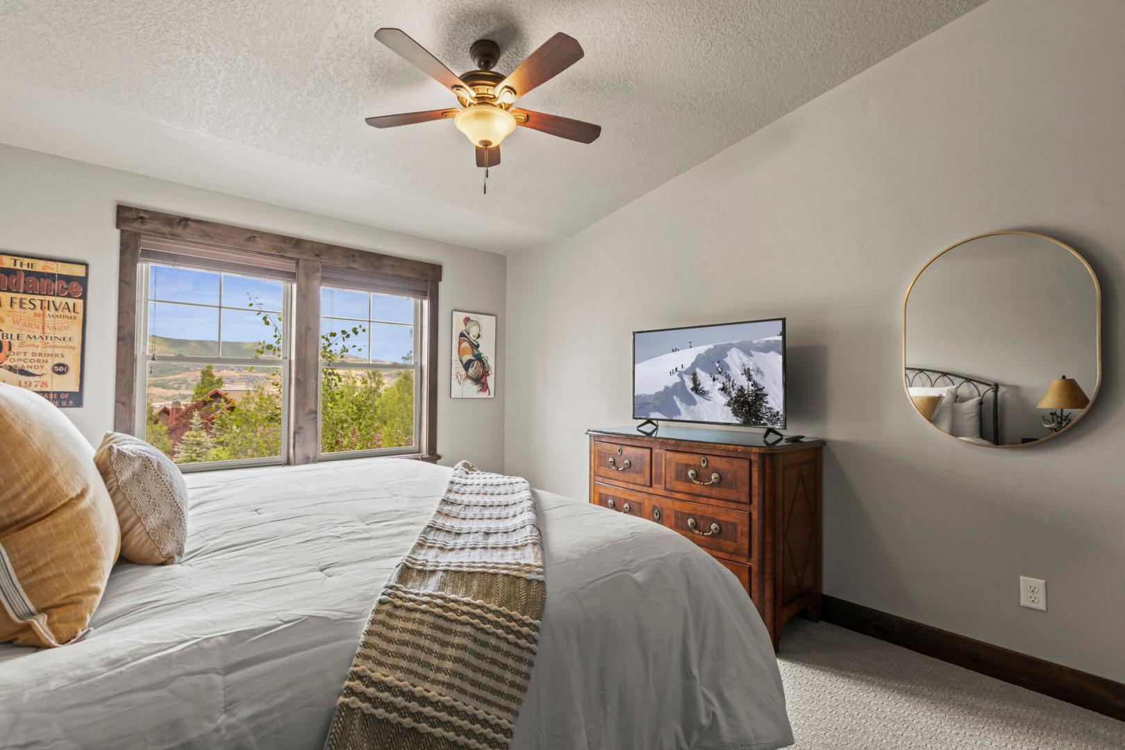 Step into the master bedroom, a haven of tranquility with a plush king bed that promises a restful night's sleep. The ensuite bathroom provides a spa-like experience, featuring a dual sink vanity and a lighted mirror. With a smart TV for entertainment and ample closet space, this room ensures both privacy and comfort. Open the door to the patio and soak in the serene mountain views, savoring the crisp, fresh air.